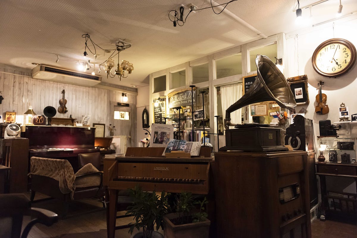 まちなかからちょっと離れた住宅街を歩いていると、ポツンと灯るあかり。扉をくぐるとそこは時間の流れが違うような不思議な空間です。壁にかかったクラシックな時計は、すべて違う時間を指しています。「ここにいつまでもいたい…」そんな気持ちになるお店です。