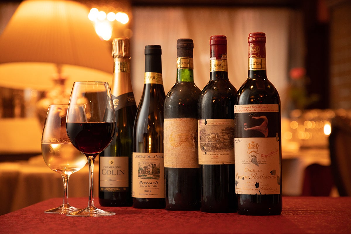 ワインリストは、地元パリでも希少な小農家の元詰めワインからシャトー・マルゴー、シャトー・ムートン・ロートシルトといった五大シャトーなど、豊富にご用意しております。