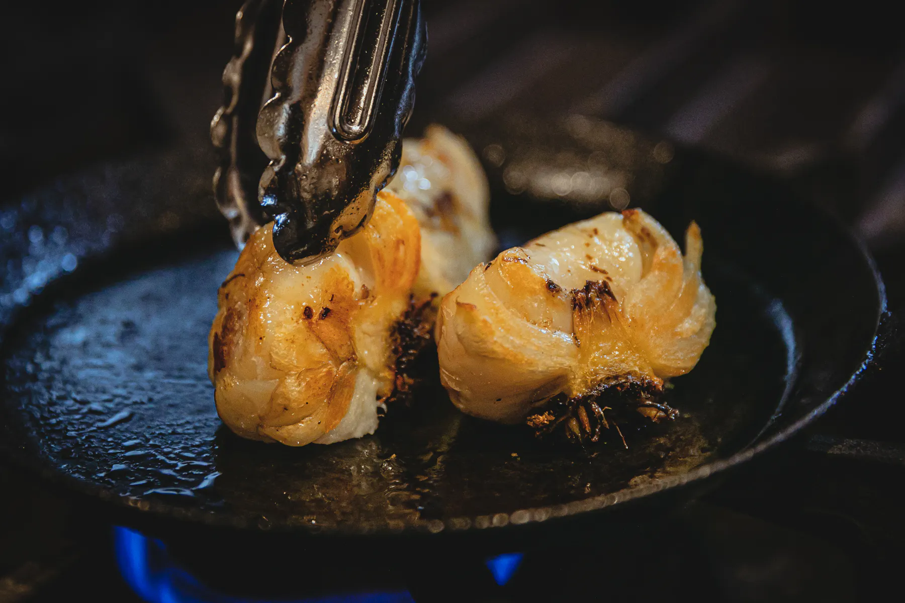 ⑦18カ月熟成させたメークイーンと虎王椎茸のソテー・春菊とレモンのコンフィのスモーク仕立て