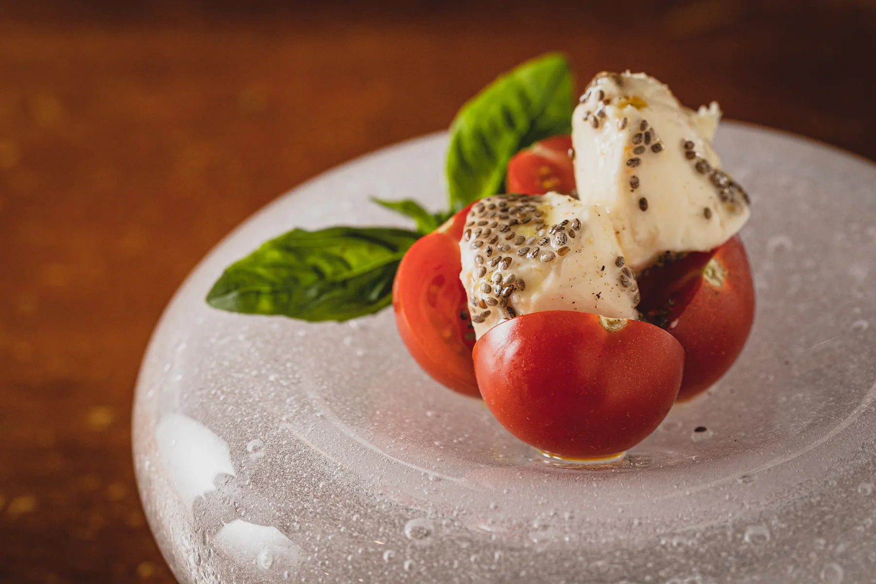 ④島トマトのカプレーゼ・チアシードとホワイトバルサミコ酢のジュレ
