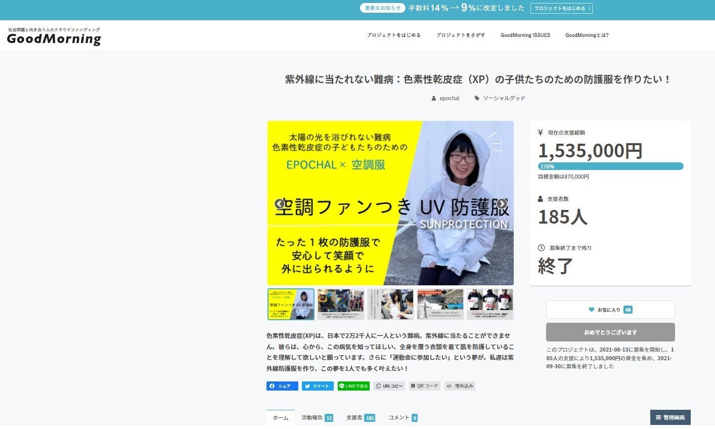 6年前は、色素性乾皮症のためのUV防護服のキッズ用にみなさまのご協力をいただきありがとうございました。