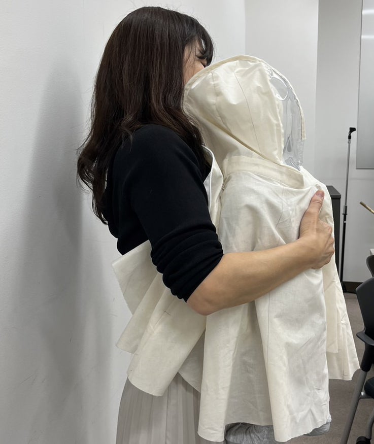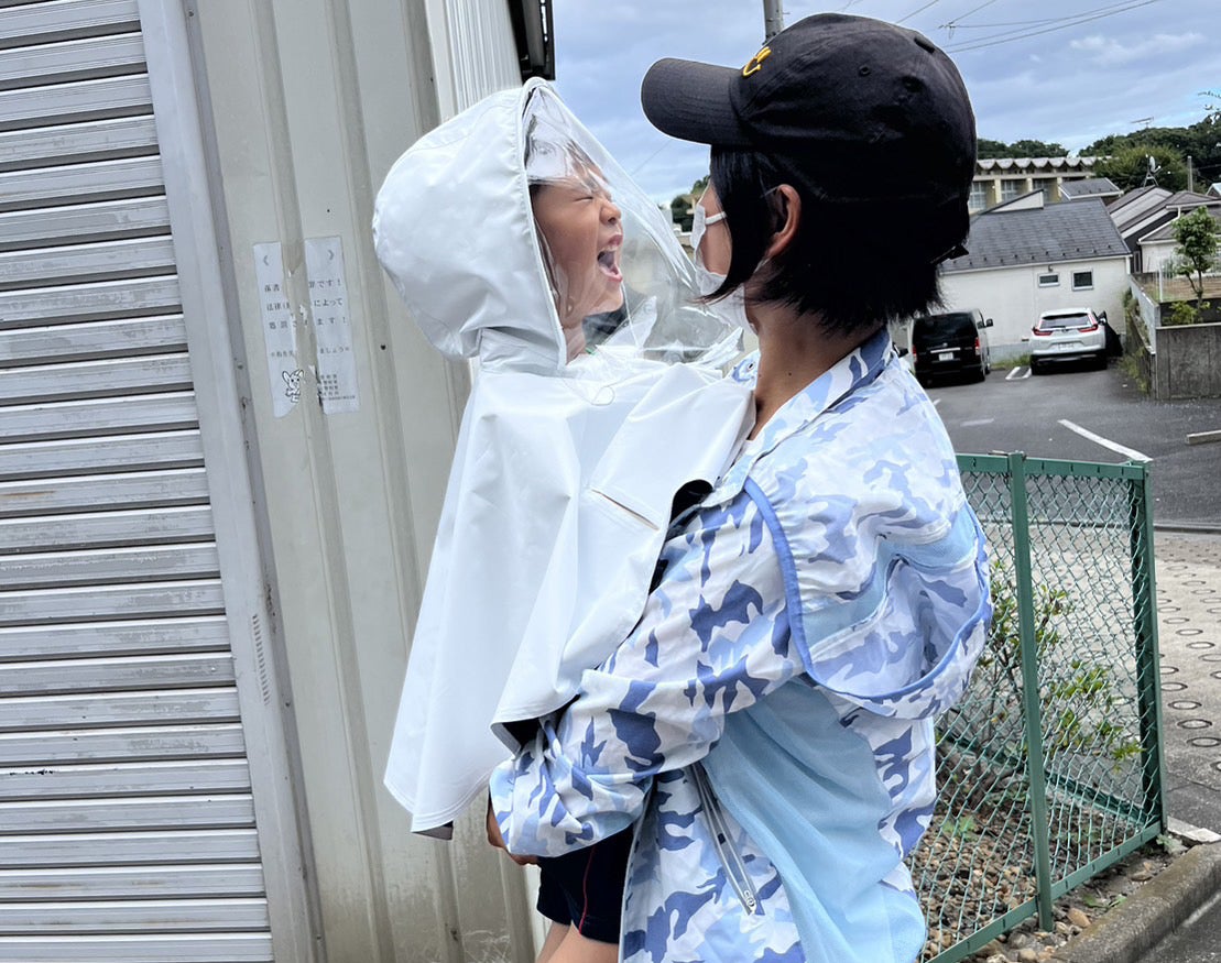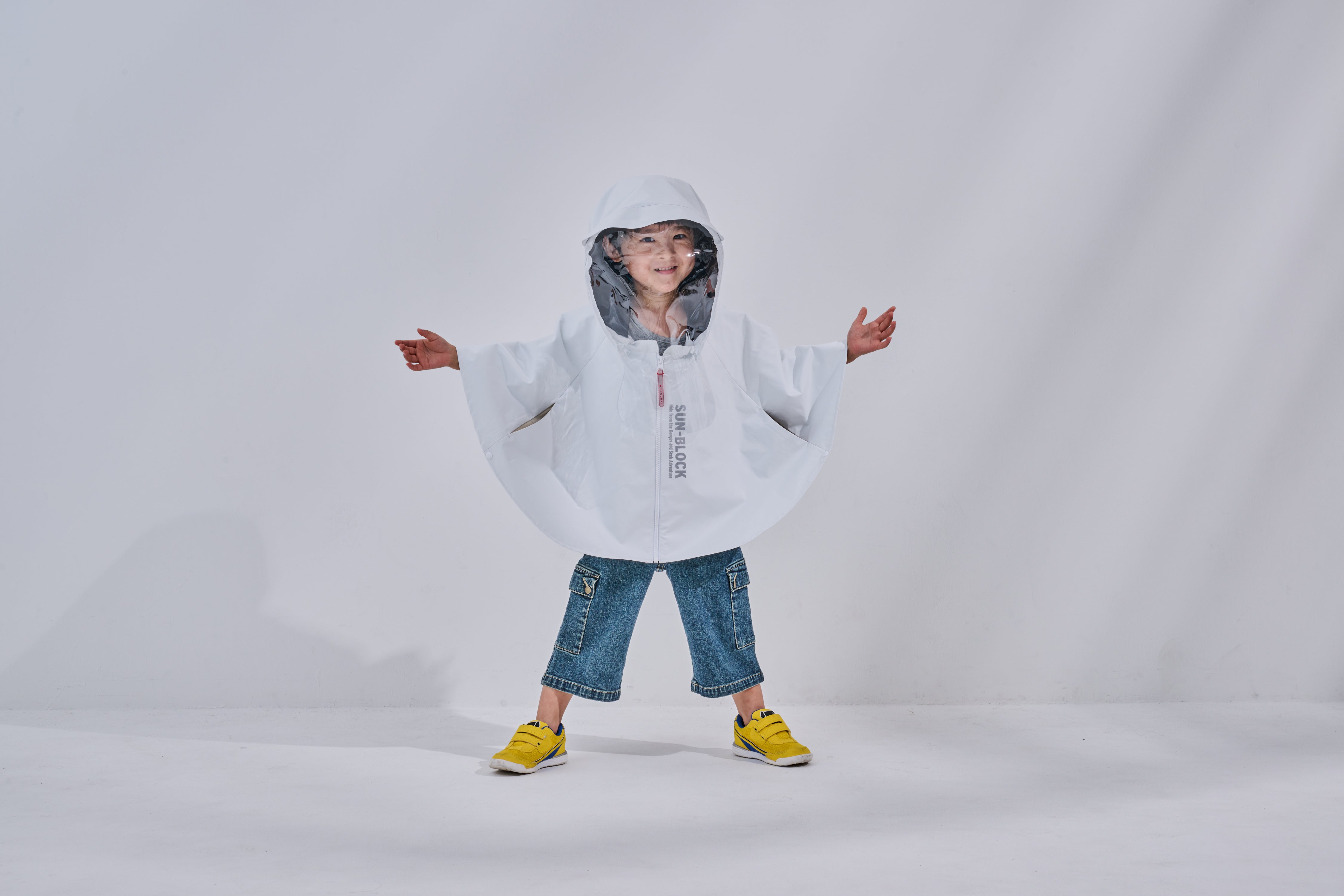 空調ファンは、危ないので、付けなくし、金額の負担もできるだけかけないようにしたいと考え、EPOCHALのブランドでも採用してきた「ケープ型」が1番通気性がよく、成長にも合わせられ、動きにも対応できるだろうと考えました。