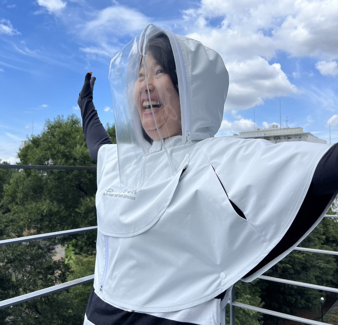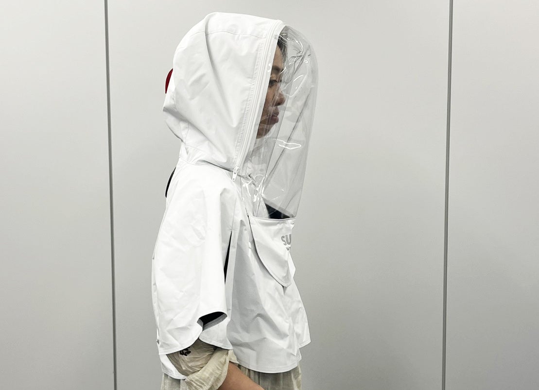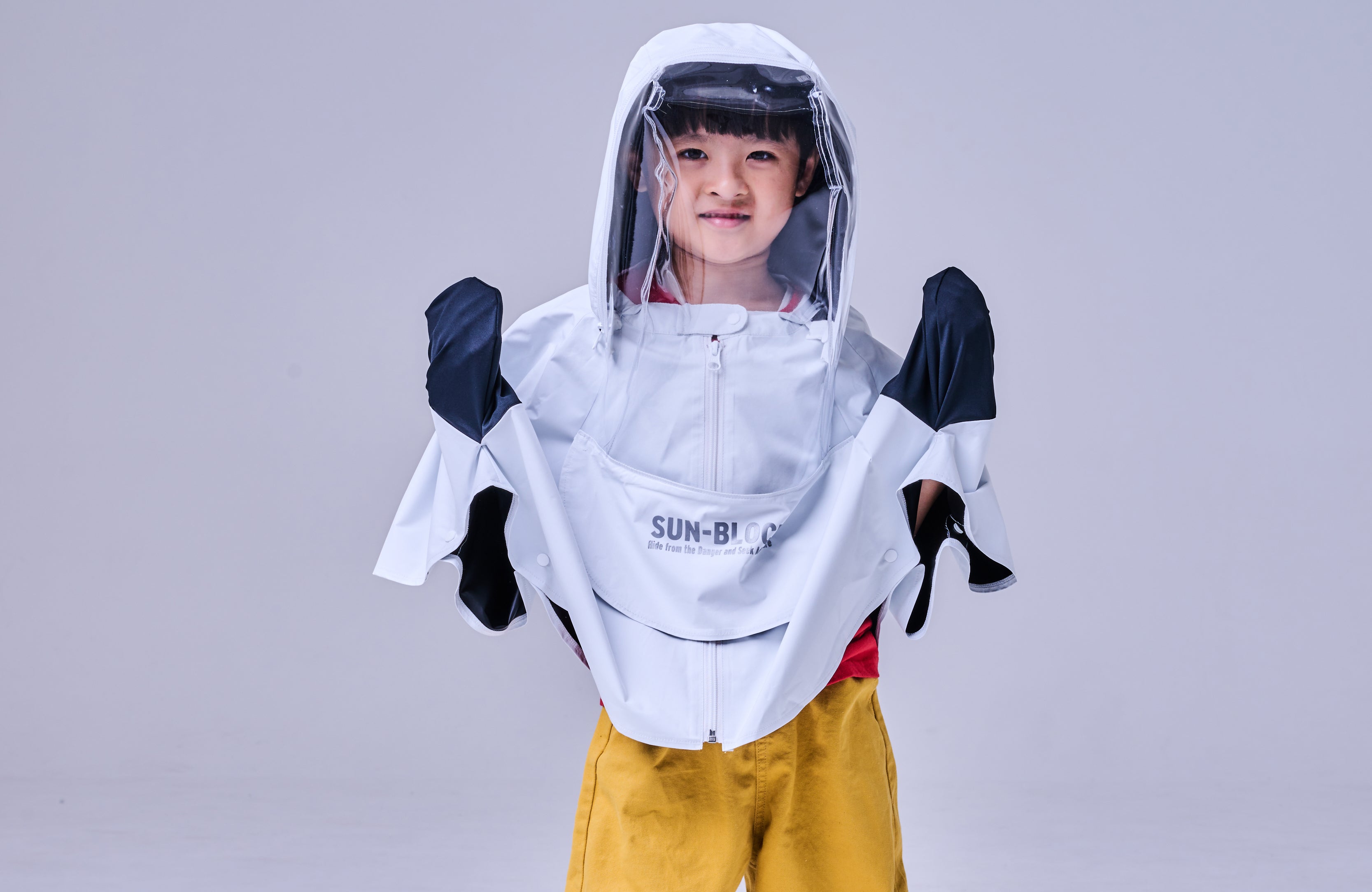 大人は、胸までをガードする完全遮蔽のUVカットケープとUVカット率99.7%以上のビニールでできたフェイスガードが形になりました。