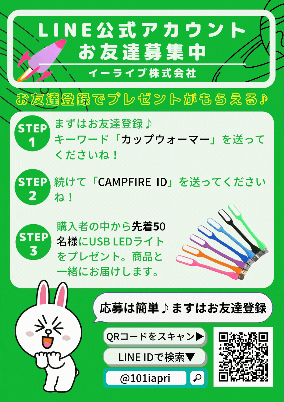 いよいよ、プロジェクト終了まで残り3日となりました!これまでたくさんのご支援購入ありがとうございます!!そして、素敵な応援メッセージを下さった皆様にも心より感謝いたします> <この度は、LINE公式アカウントを開設いたしましたので、お知らせいたします。今回、カップウォーマーをご購入いただいた方から応募いただいた先着50名様にパソコンやモバイルバッテリーなどに挿せば明かりが点く「USB LEDライト」をプレゼントしちゃいます!!詳しい応募方法は画像をご確認ください♪早いもの勝ちのため、ぜひこの機会をお見逃しなく!!イーライブプロジェクト制作チームより
