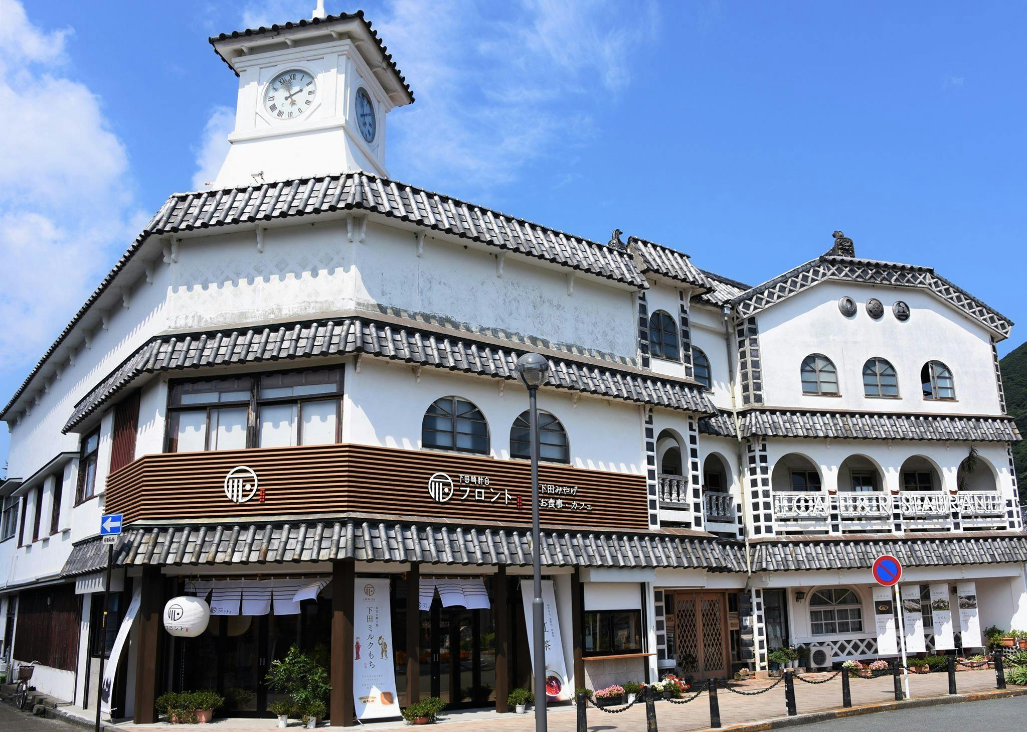 前回紹介したナンズビレッジが車で移動される方にとって下田の表玄関なら、今回ご紹介する「時計台フロント」は、電車でいらっしゃる方にとっての表玄関的存在です。伊豆急下田駅の開通(昭和36年)と同時に創業した、おみやげもの屋さんと食事処を併設する、時計台が目印のお店です。