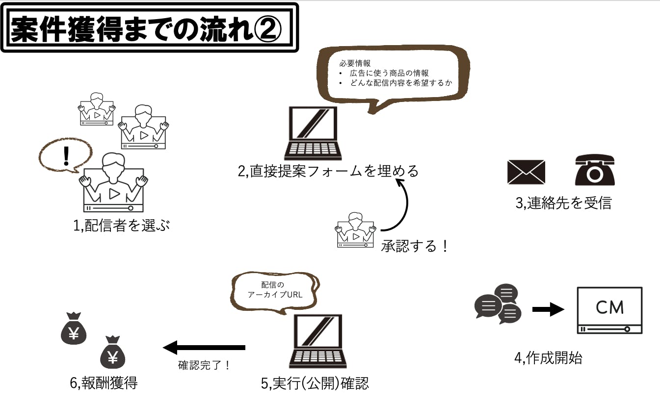 案件を選んだ配信者を採用する、もしくは、直接提案した配信者が承認します。