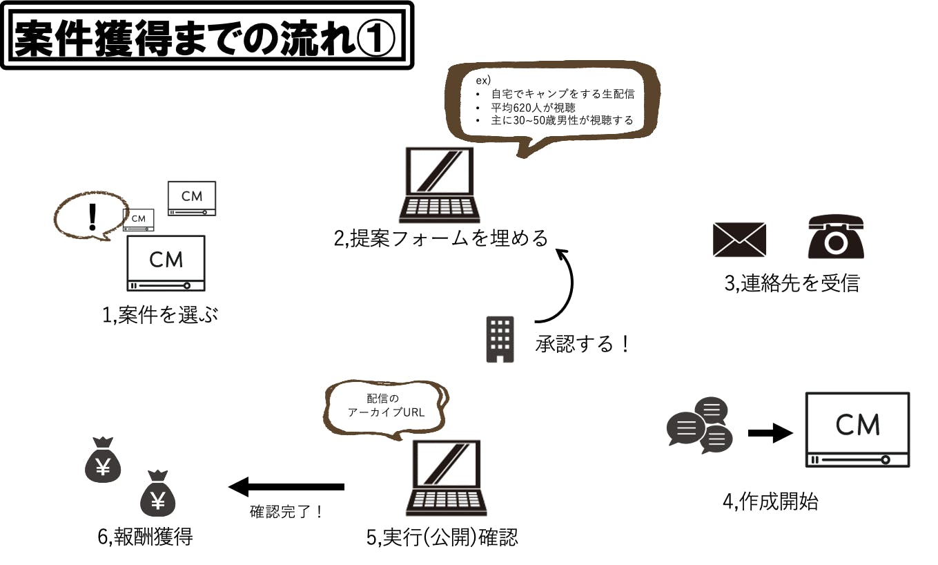 企業側...案件内容を記入し募集します。もしくは、気に入った配信者に直接提案をします。