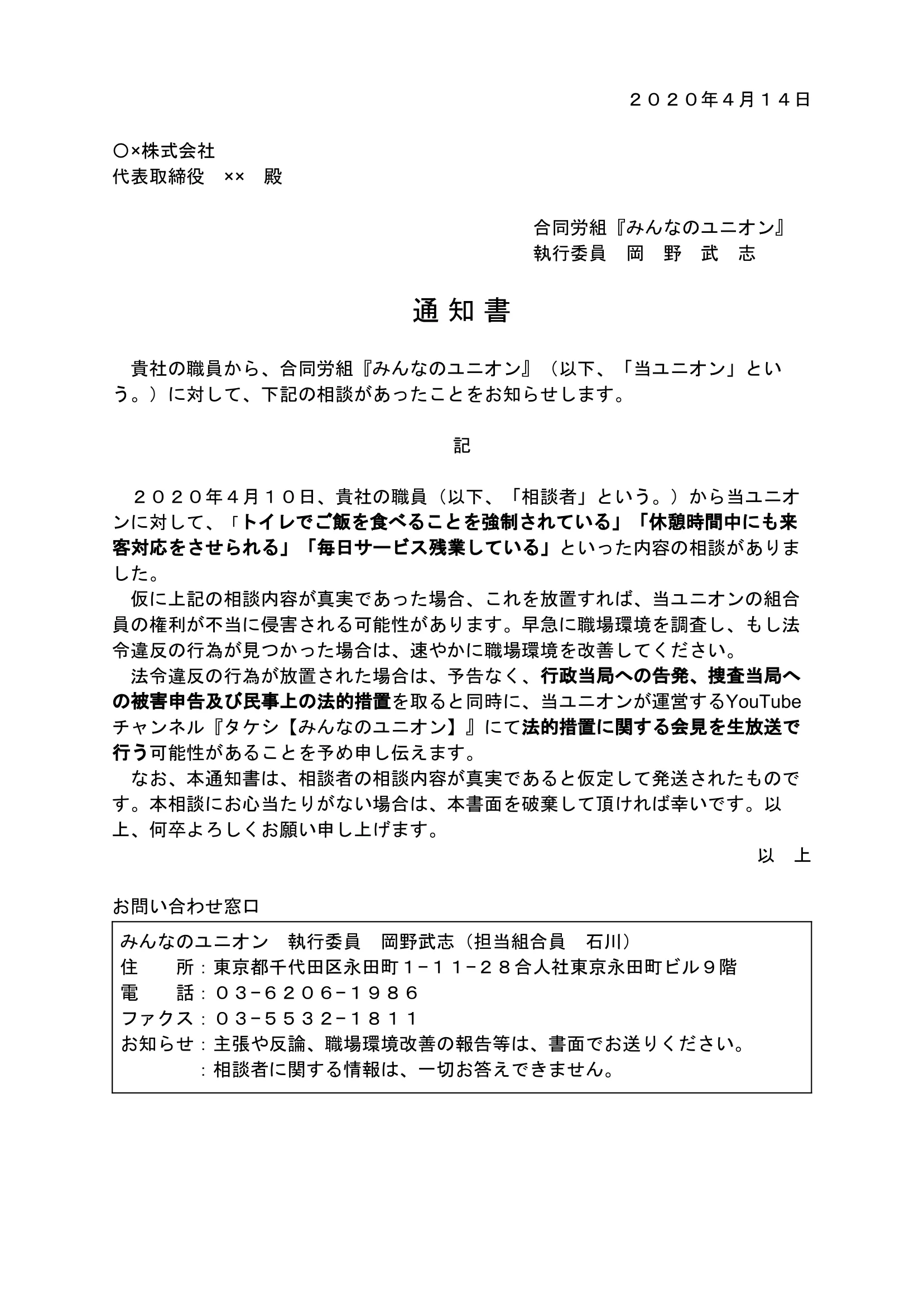 ・組合員に代わり、会社に職場改善を要求する通知をユニオン名義で送る