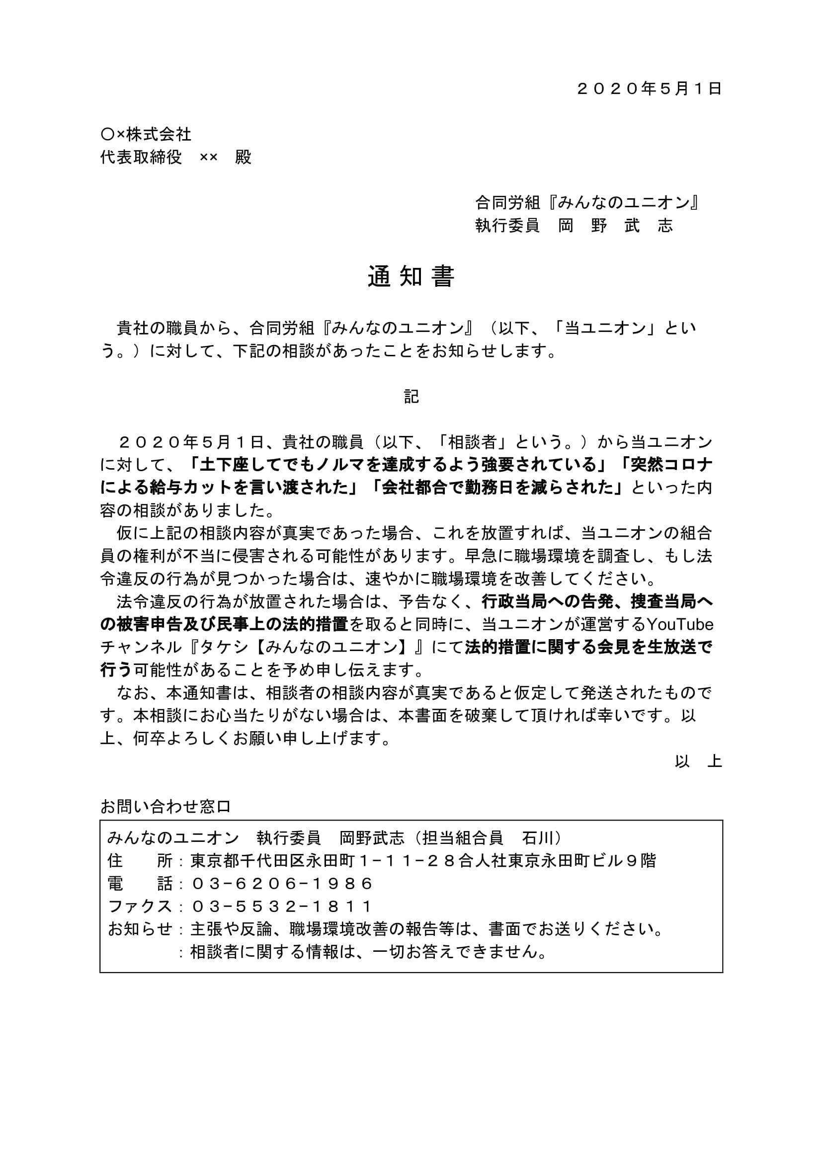 みんなのユニオンは、2020年の3月中旬から活動を開始しており、4月には22通の通知書を会社に送付しました。