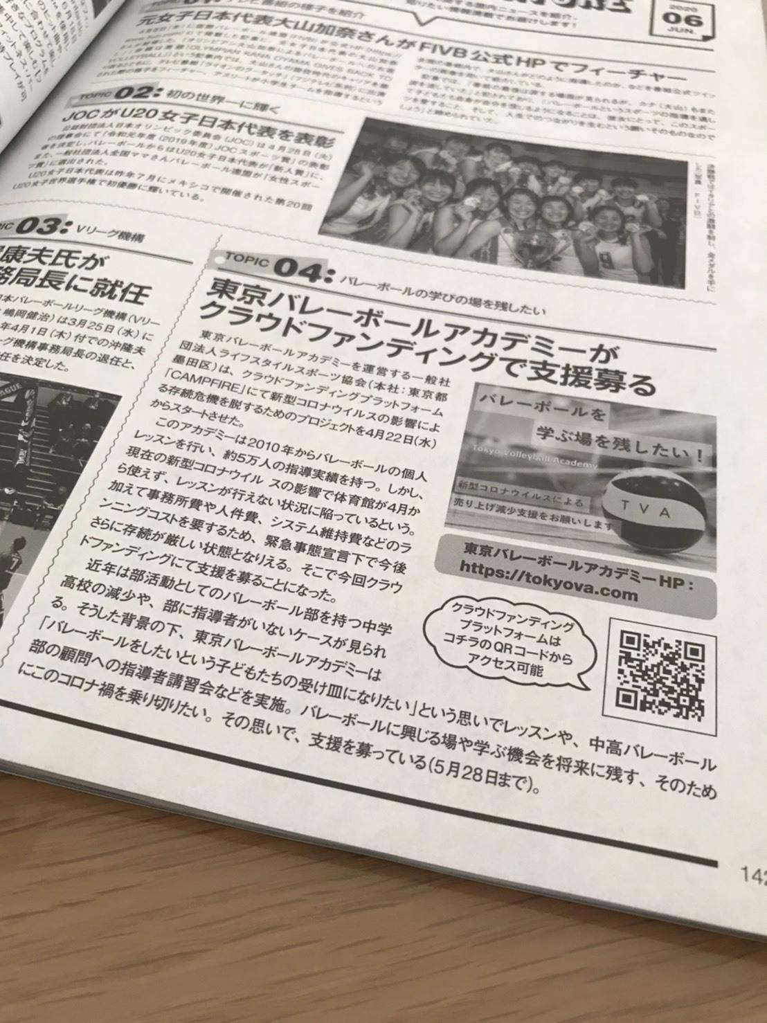 東京バレーボールアカデミーが行っているクラウドファンディングの取り組みが、5月15日発売の月刊バレーボール6月号に取り上げられました!