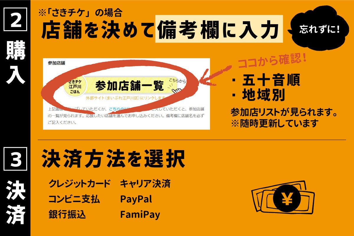 つまり、皆様がさきチケを購入することが、皆様が応援したいと思っている江戸川区の飲食店を直接支援することに繋がるのです。