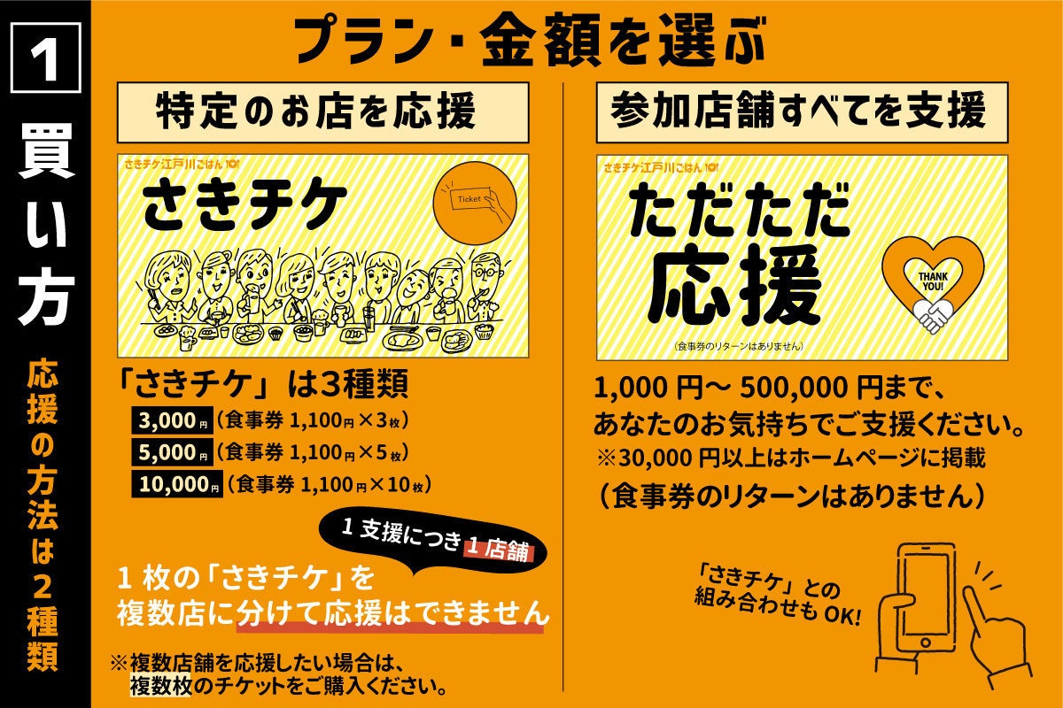 ※1,000円または30,000円以上の「ただただ応援プラン」は、食事券の提供はありません。支援する店舗を指定することもできません。特定の店舗を支援したい場合は「さきチケ購入」を選択ください。