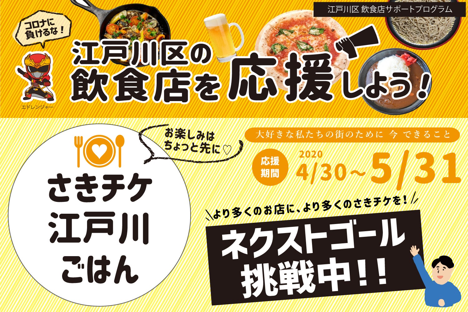 2020年4月30日よりスタートした、江戸川区の飲食店応援プロジェクト『さきチケ江戸川ごはん』は、5月31日をもちまして募集期間を終えました。プロジェクトの結果を以下の通りご報告いたします。支援総額 16,313,695円支援者数 1,354人目標達成率 326%1か月間という短い期間にも関わらず、スタート当初の目標額 500万円 を大きく上回る結果となりました。参加店舗および事務局一同、皆様のご支援や、応援のメッセージに心熱くしております!本当に、ありがとうございました!ーーーー支援者の皆様から「ご近所に素敵な店があったことを発見した」「ずっと気になっていた店に行くきっかけになった」という声が多く寄せられました。外出自粛は大変な経験でしたが、地元の魅力を再発見したという方も多いのではないでしょうか。緊急事態宣言も解除され、街も徐々に活気を取り戻しつつあります。7月になったら、ぜひ「さきチケ」を使って美味しい食事やお酒を楽しんでください。また、今回さきチケ購入に至らなかったお店も、機会があれば是非足を運んでみてください。今回のプロジェクトが、このえどがわの街がさらに元気に盛り上がるきっかけになることを願っています。参加店舗一同さきチケ江戸川ごはん事務局 まいぷれ江戸川区※当プロジェクトに関する情報は下記SNSでも随時発信しております。よろしければ、フォローいただけますようお願いいたします。【Facebook】https://www.facebook.com/sakiticket.edogawa/【Twitter】https://twitter.com/sakitix_Edogawa