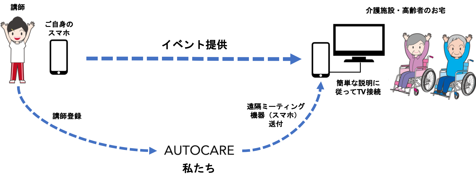 ・施設や高齢者のご自宅のテレビに向けて、遠隔でイベントを提供できる機会を提供します。スマートフォンやインターネット通信環境をご自身でご用意いただく必要はありますが、様々な高齢者の方にイベントをご提供いただけます。