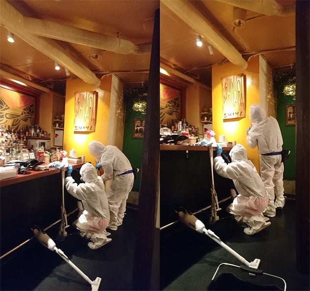 本日はSWEET&HEAVYの主催者B.K.君からお話しを頂きSHIVA店内の除菌&消毒作業をやって頂きました。B.K.君は飲食店を中心に除菌&消毒の仕事を新事業として展開されています。会社名はS.K WORLD MEDICALです。壁・床・机・椅子と徹底的にやってもらいました。プロの仕事はやはり違いますね!作業終了後の店内はよりクリーン度合いが増して清々しいです♪これで更に綺麗な環境でお酒を楽しんで頂けると思います!今夜も皆様のご来店お待ちしています♪Bar Shiva