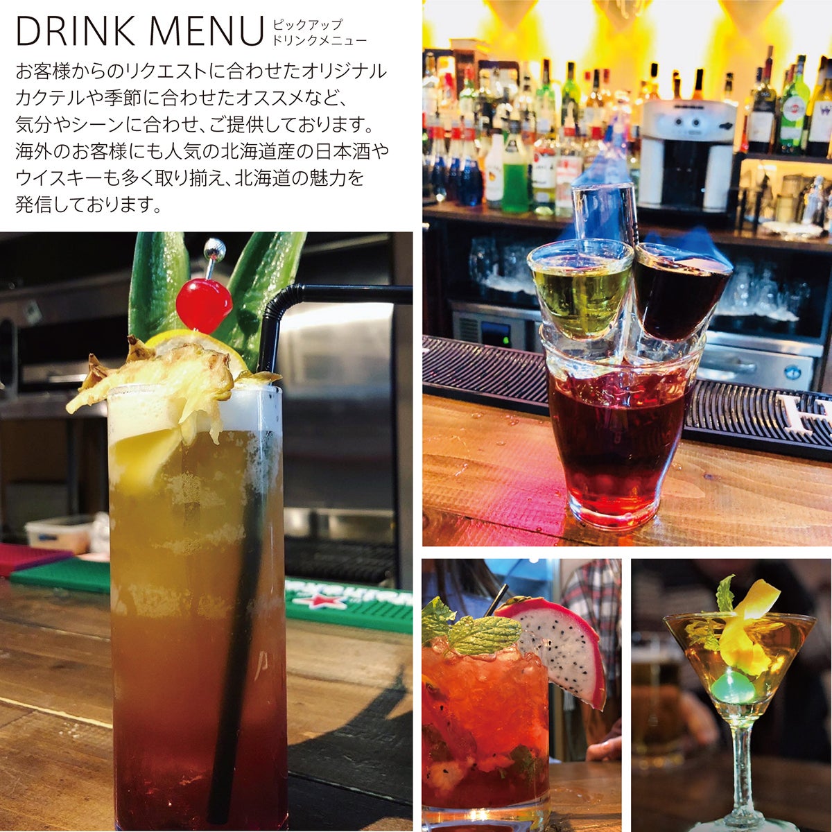 外国人スタッフ、日本人スタッフともにチームとなり多国籍な環境で、海外のイベントやスタイルを多く取り入れ、観光客・外国人と地元の方々とのインターナショナルな交流の場、北海道の魅力が詰まったお酒や食材も積極的に活用し北海道・札幌を発信するとともに、在住外国人の語学を生かせる雇用の場としても提供してまいりました。