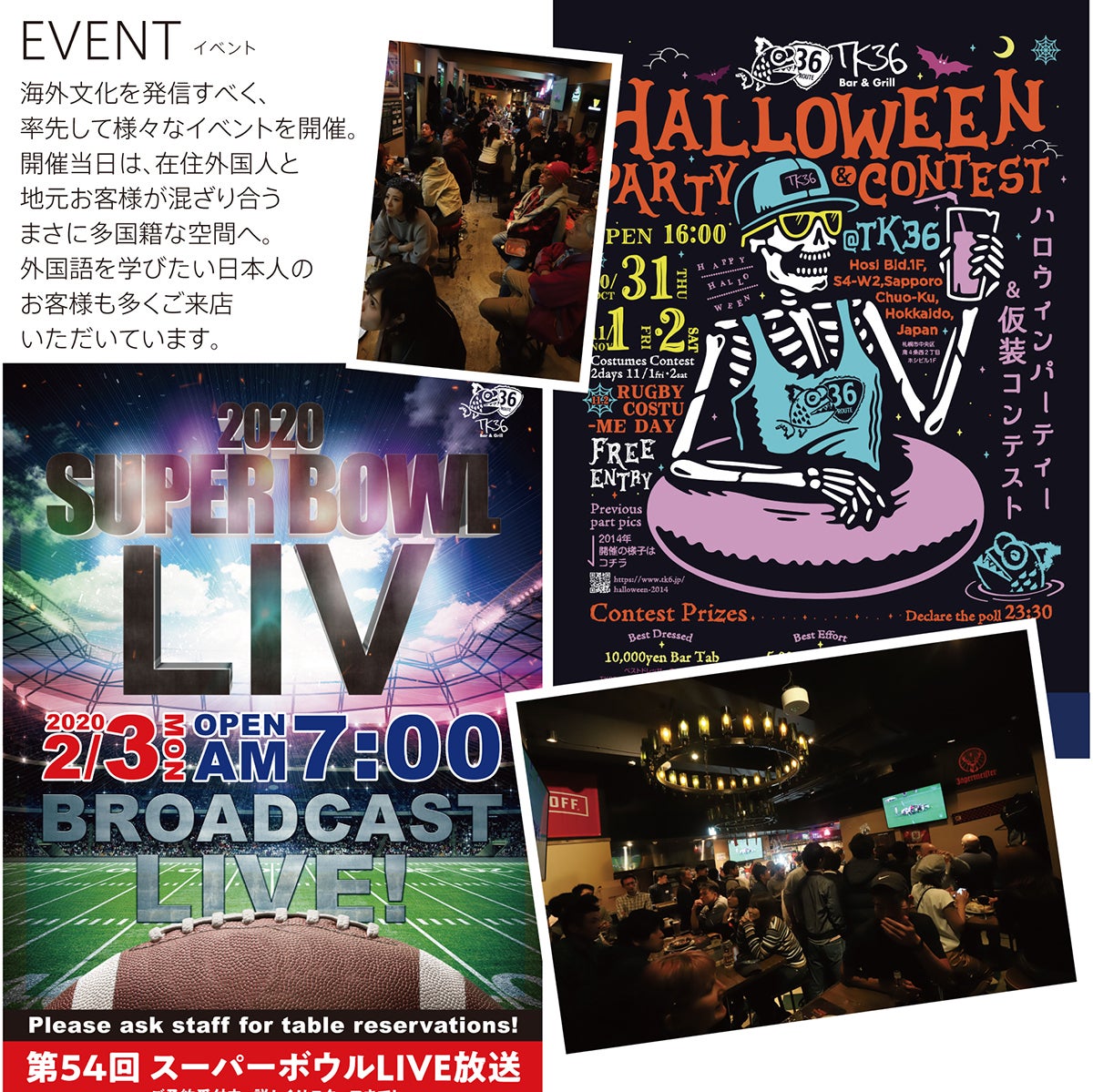 はじめまして。北海道札幌市ススキノに店舗を構える「スポーツバー&グリル TK36」です。