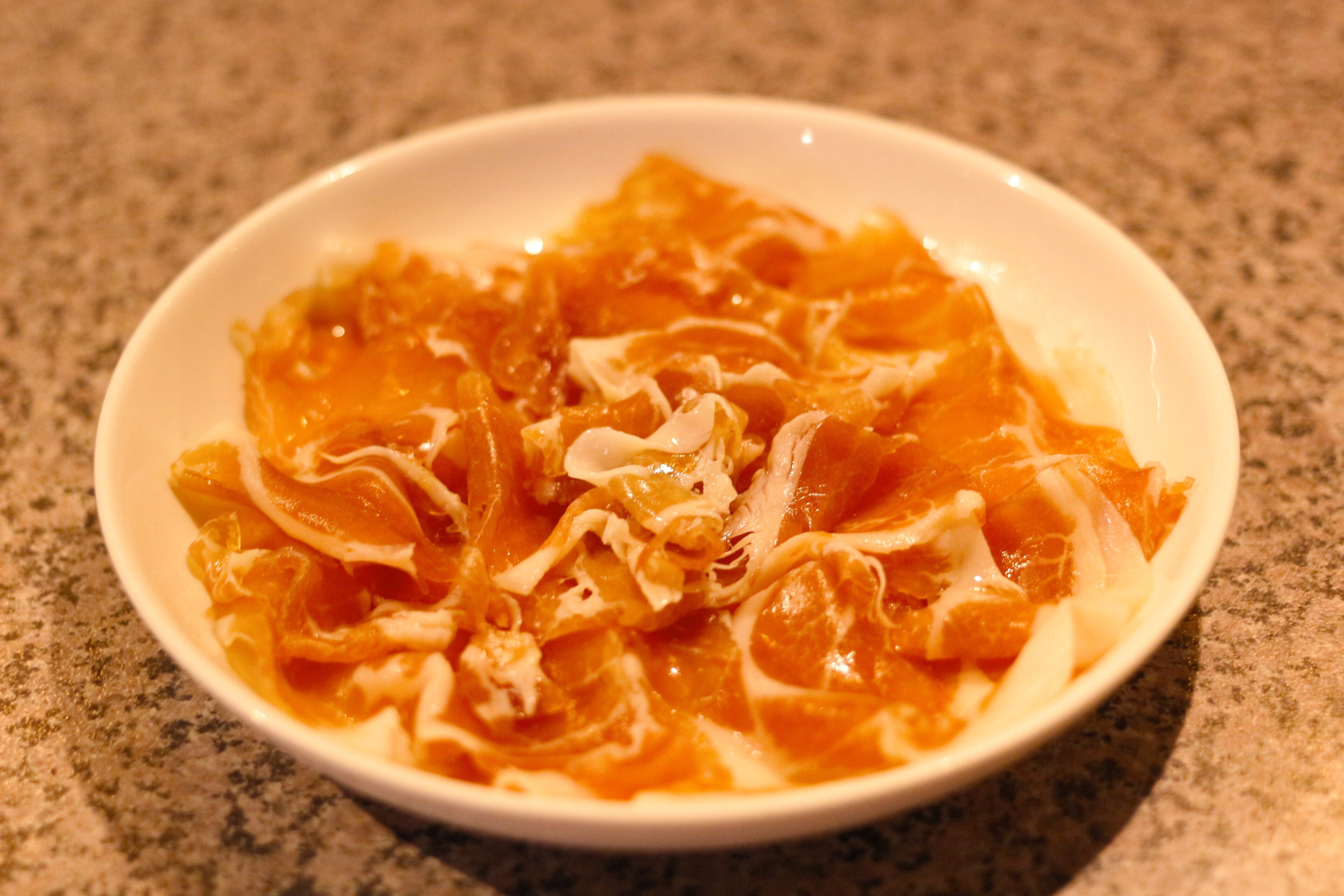 当店の売りの一つに生ハム原木があります。スタッフがその場で削いでお通しとして提供しております。切りたての生ハム。ゴールデン街というレトロな空気の中で少しだけお洒落な雰囲気が味わえます。