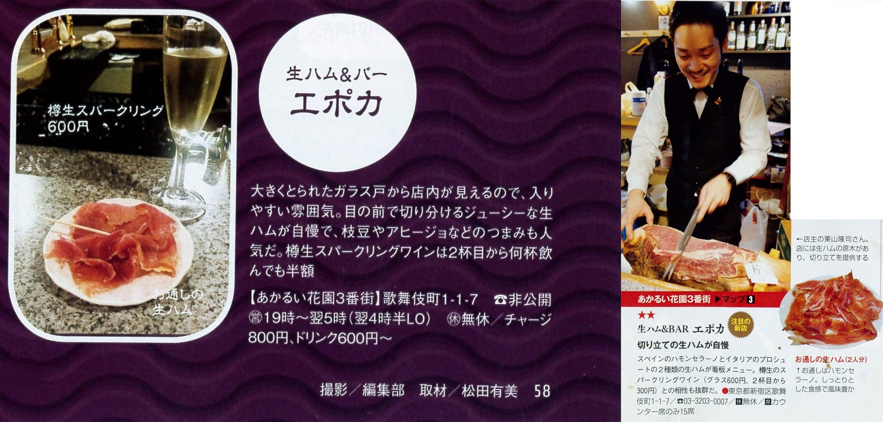 はじめまして。私たちは新宿ゴールデン街三番街の「生ハム&bar エポカ」です。