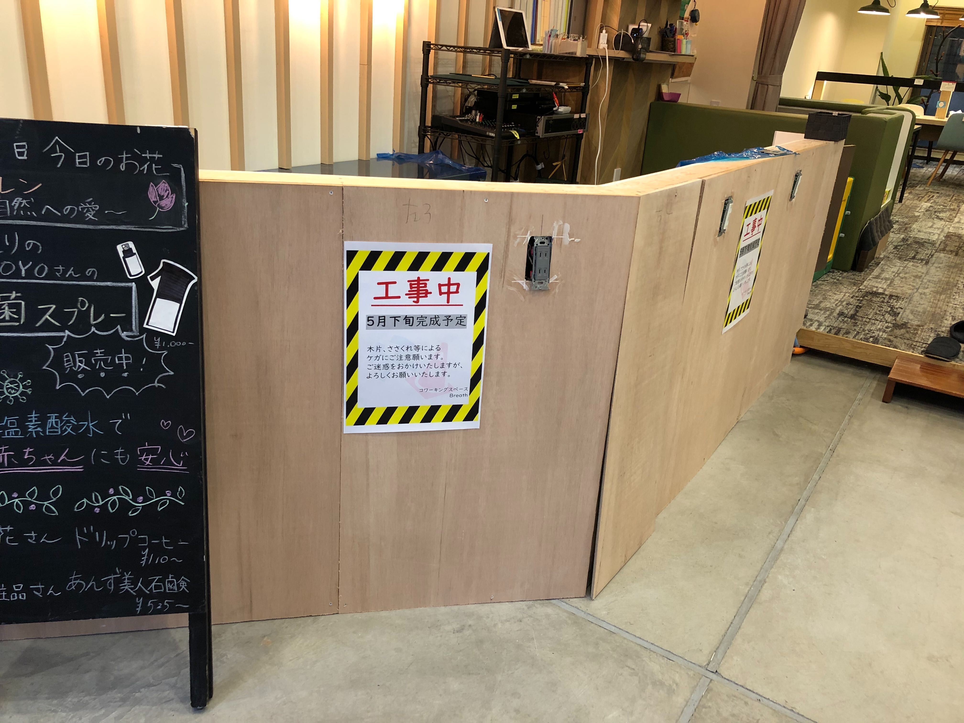 こんにちは、コワーキングスペースBreathです!引き続いてのご支援、本当にありがとうございます。残り15日となり、折り返し地点です!そんな中なんとなんと、あっという間に工事が完了しました。職人さんたちに感謝感謝です…こんな状況からスタートしたわけですが、あっという間に枠ができ、機材を入れ(チルラボさんコールドテーブルのご提供ありがとうございます!!!)あっという間にテーブルが付き完成!前の受付の資材をそのまま使ってもらったり、色味を変えずにやってもらったりしたので、以前のデザインを知っている方からも違和感ないとのお声をいただいています。良かったです。驚いたのはこのカウンターテーブルの奥行きの広さ!こんなにスペースがあるとは思ってもみなかったので、とても嬉しいです。パソコンも資料も広げられて、さらにドリンクもゆったり置ける。机下には電源もあるので快適です。コワーキングスペースとしては席数を減らすわけにはいかず、キッチンを作ったらどうなってしまうのだろう…とやや心配していたのですが、特に席は減ることなく使えそうなので安心しました。また以前よりラウンジはベビーカーの方がそのまま仕事をするのに良かったので、テーブル席も残してあります。工事が完了したので次は許可取得です。早速保健所に申請してきたので、来週実際に来ていただいてのチェックがあります。少しずつですが前進できていること、私たちも嬉しく思っています。まだまだ状況は安心できるものではありませんが、一歩一歩進んでいきたいものですね。残り半月ですがクラウドファンディングのご協力どうぞよろしくお願いいたします。