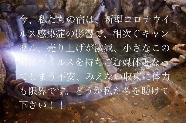 コロナウイルスの感染拡大に伴い、3月から売り上げが2割減、4月に入ると相次ぐキャンセルに8割減、売り上げがなくとも掛かる冷泉を沸かす燃料費、固定費も賄えず、どこまで持ち堪えればいいのか、終わりが見えないウイルスの感染拡大に存続危機に直面しています。