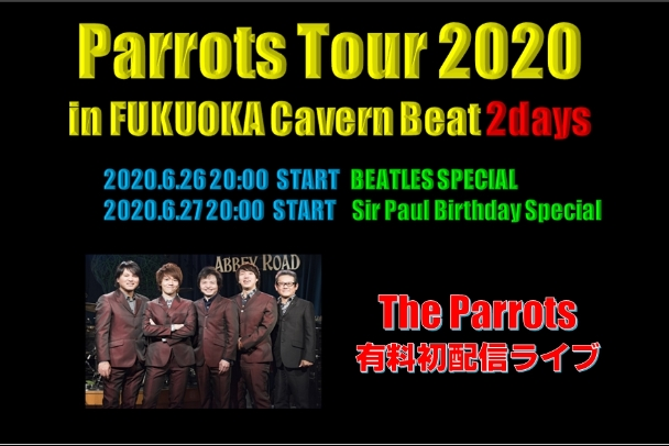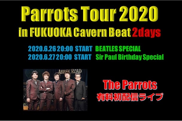 世界的なビートルズバンドでありますパロッツは六本木が再開発のためホームであります六本木アビーロードが移転となり移転する5月に全国ツアーを回る予定で福岡は「PARROTS TOUR 2020 in 福岡キャバーンビート」として5月30日31日に2days実施する予定でチケットも絶賛発売中だったのですが、全国的に緊急事態宣言が5月31日まで延期となり開催することは皆さまの安全最優先で開催不能と判断いたしました。楽しみにされていたパロッツファンの皆様本当に申し訳ございません。