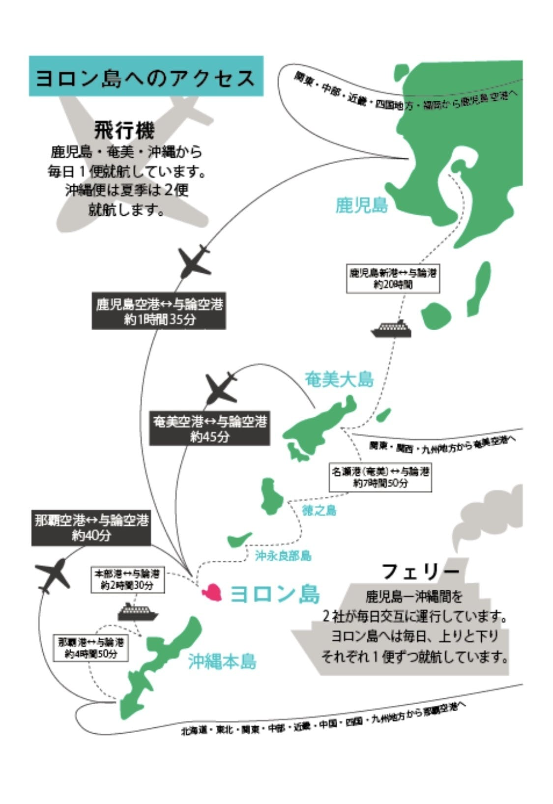 与論島へのアクセスは、鹿児島・奄美・沖縄から、飛行機&フェリーにて可能です。