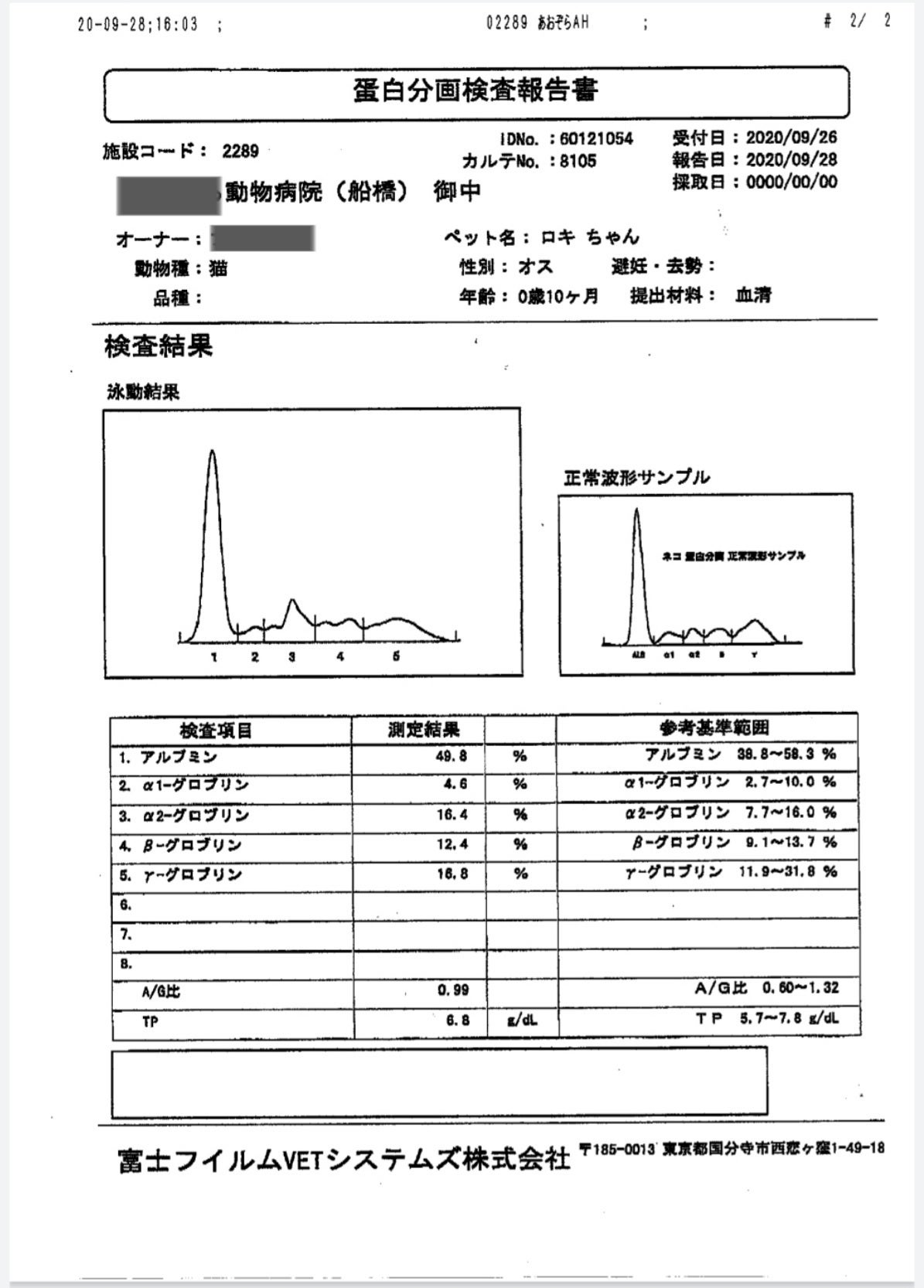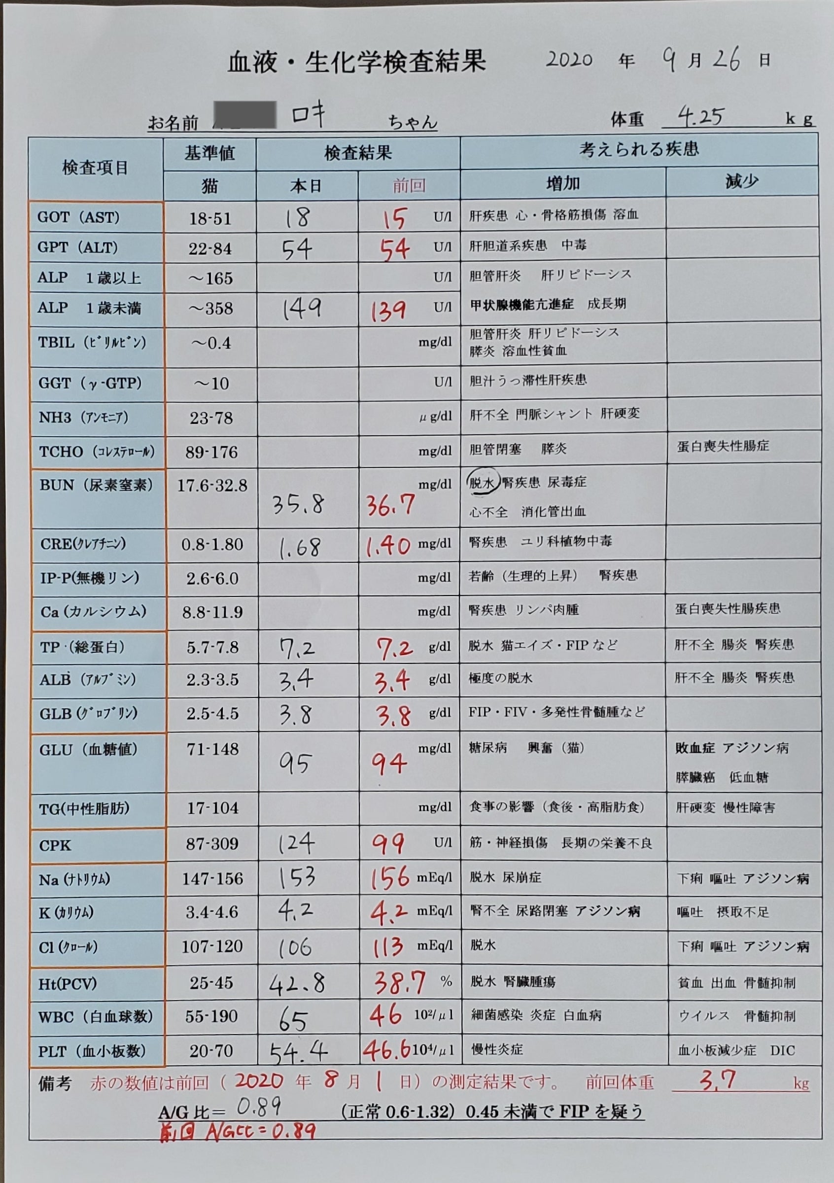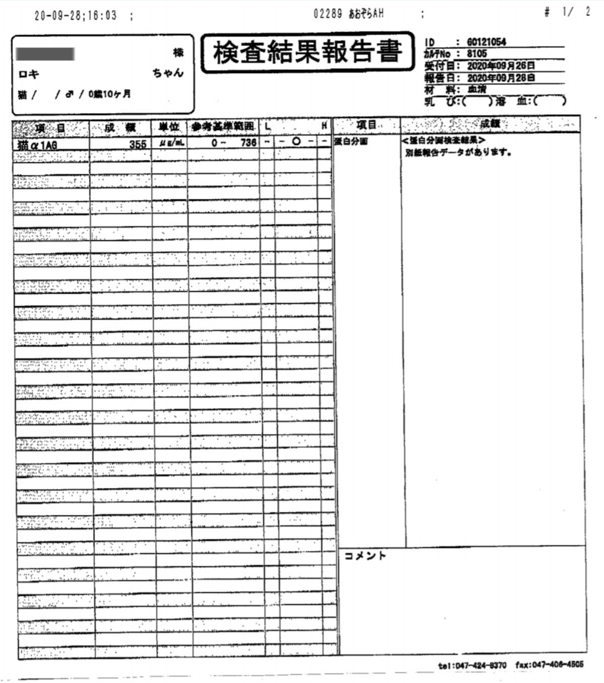 『 ロキちゃんの最終検査の報告です。 前回よりさらに数値が良くなっており、ここまで来たらもう大丈夫でしょう。 長かったですが、飼主様もロキちゃんも大変頑張りましたね。 私の役目としてはこれで終わりですが、引き続き様子を見守ってあげてください。』