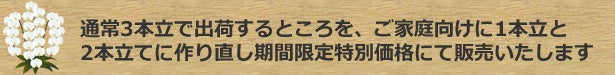 通常なら3本立で販売する胡蝶蘭を、ご家庭で楽しめる1本立に作り直しお求めやすいお値段で販売いたします。