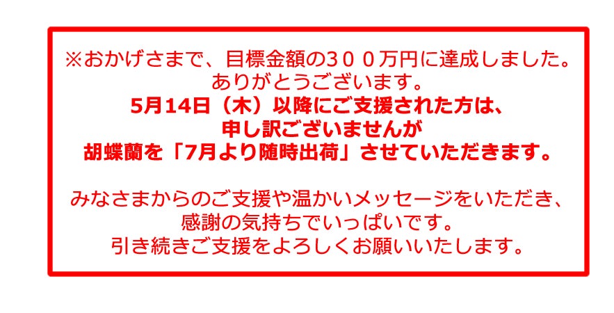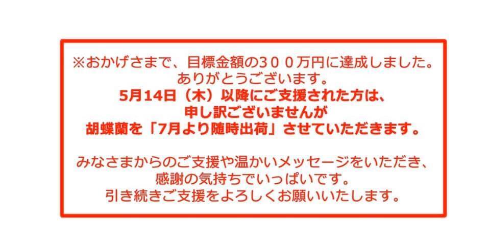 2020/05/17 11:13皆さまのお陰で目標金額300万円を達成しました。6月出荷を控えているにも関わらず行き場が決まっていなかった胡蝶蘭のお届先が全て決まりました。この場をお借りして御礼申し上げます。6月のフラワーロスが全て回避できました。5月14日以降にご支援のお申込みをして頂いた支援者様のリターンのお届けは7月となります。何卒宜しくお願い申し上げます。新型コロナの状況は7月はどうなっているのか?正直わかりません、しかしながら経済がコロナ以前の状況に戻っていることはないと考えております。引き続きご支援を頂ければ幸いです。 もっと見るテレビ朝日スーパーJチャンネルで紹介されました