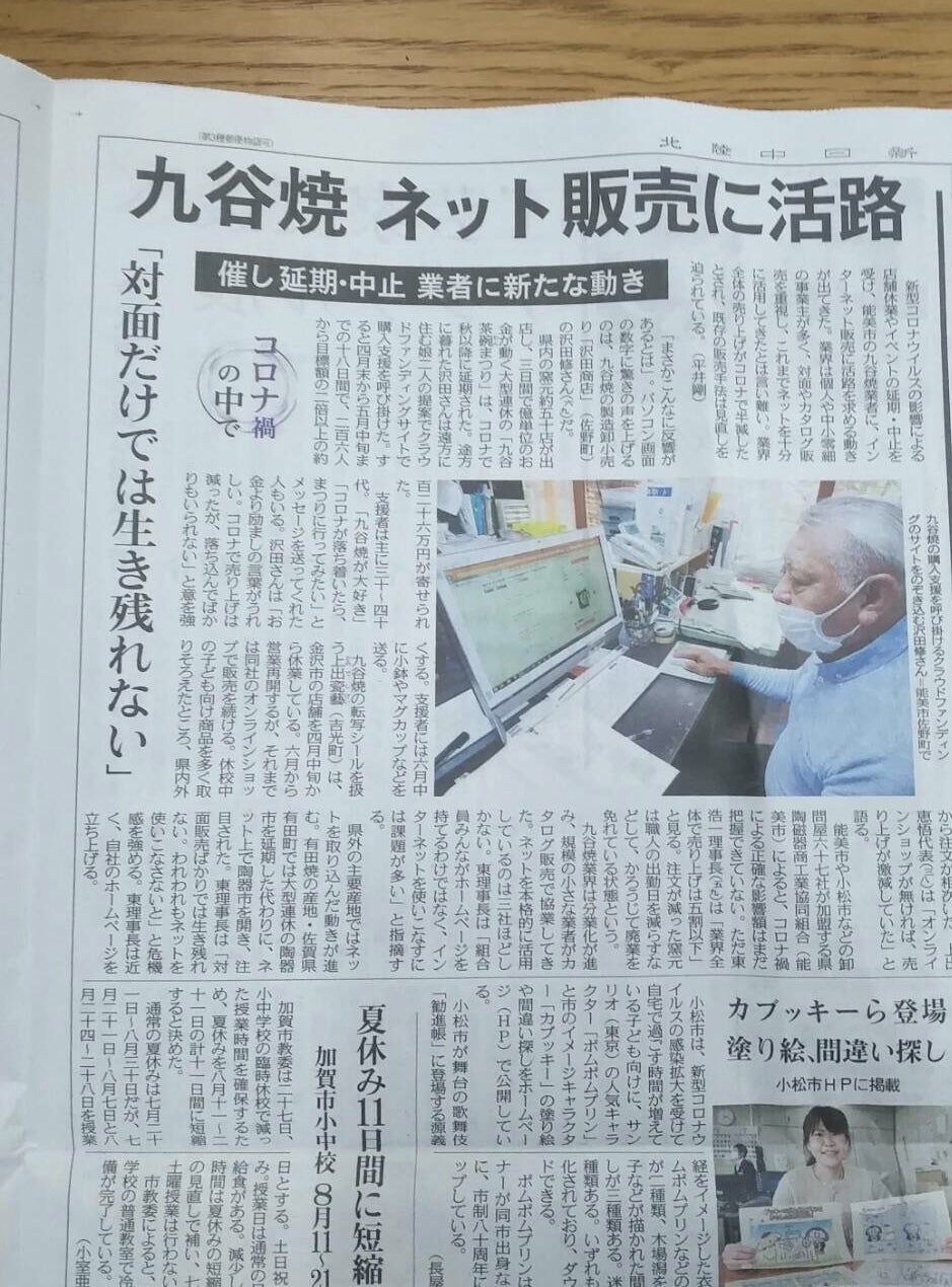 2020/06/10 09:00おはようございます、沢田商店です。本日は支援者のみなさまに、感謝を込めてのご報告です。2020年5月28日付の北陸中日新聞に、本クラウドファウンディングが掲載されました!苦境の中ではありますが、皆様からのご支援が確実に実りあるものになっています。九谷焼業界のみならず、石川県、北陸の伝統産業に勇気をもたらしてくださいました。心より御礼申し上げます。また、従来の販売方法を見直す良いきっかけとなりましたことも、大きな収穫です。今後とも、前向きにものづくりに励んで参りますので、ぜひ九谷焼をご愛用くださいますよう、よろしくお願いいたします。九谷焼 有限会社 沢田商店オンラインショップ https://sawadashop.stores.jpインスタグラム https://www.instagram.com/sawadakutani もっと見る