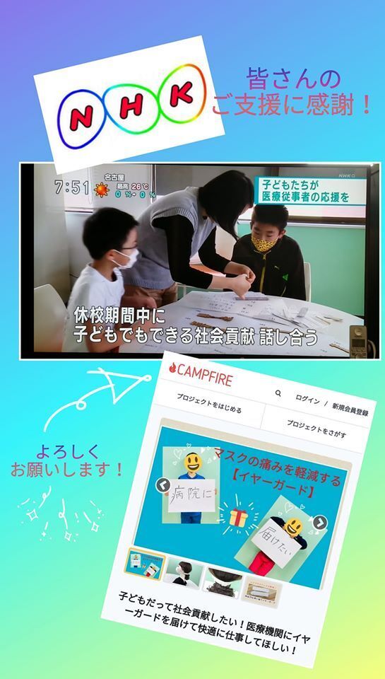 【NHKで紹介されました!】昨日は放映変更が二転三転となりお騒がせいたしました。今朝の7:45のNHKニュースで子ども達の活動が紹介されました。朝ごはん時間なので一緒にご覧になったお子様もいるかもしれません。同世代の活動をみて、自分たち子どもの可能性を感じてもらえたら嬉しいです。お見逃しの方は放送された後にこちらで1週間ほど見ることができるとのことです。↓↓https://www3.nhk.or.jp/lnews/shizuoka/#!/2/休校期間だったからこそ、子ども達の「やってみたい」にじっくりと添うことが出来た活動だと思ってます。子ども達の「やってみたかった」にしたくないという思いでこのプロジェクトを見切り発車してしました…が、本当に多くの周りの大人メンターの方々のご好意とご協力で活動できて感謝しかありません。ご支援頂きました皆さま、本当にありがとうございます。引き続き頑張りますので皆さんご支援よろしくお願いします。