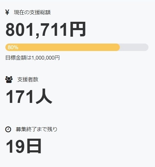 そして本日、ご支援いただいた総額が目標まで80%を超えました!応援してくださった皆様、温かいコメントをくださった皆様、本当にありがとうございます。