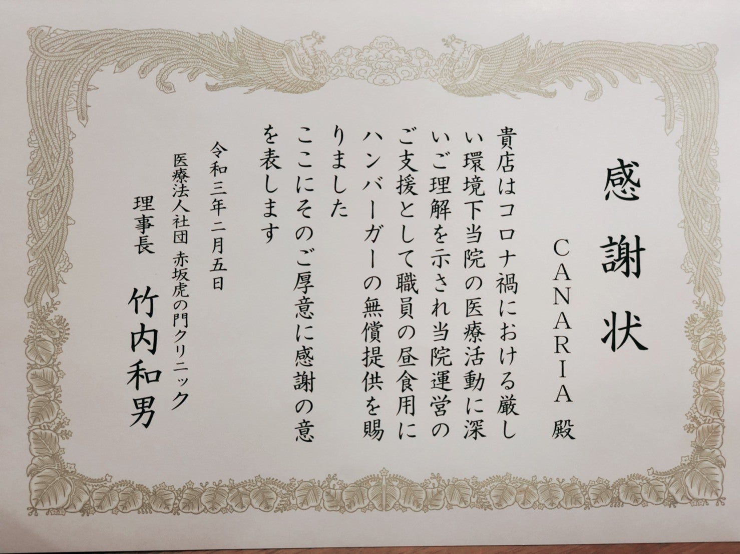 2021/02/10 11:01医療従事者に「美味しい&栄養」で元気を!活力を!第2弾のご支援、誠にありがとうございました。今回も多くのご支援をいただき、20名様から合計82,500円のご支援金をいただき、プロジェクトを進めさせていただきました。以下、今回提供させていただいた施設様です。(ご要望により一部施設名の公表を伏せさせていただいております。)■赤坂 虎の門クリニック様■赤坂 一ツ木通りクリニック様■新橋 松崎内科クリニック様■赤坂 清水クリニック様1月12日より約1か月間で170個のハンバーガーを無償提供させていただきました。提供先の方々には喜んでいただき、感謝状まで頂戴することができました。ご支援くださった皆様に対しての感謝状でもあり、とてもうれしく思っております。今回のクラウドファンディングでのプロジェクトは終了となりましたが、【医療従事者に「美味しい&栄養」で元気を!活力を!第3弾】として延長された緊急事態宣言が解除されるまで店舗では活動していこうと思っております。また個別にメッセージやリターン品などをお送りさせていただきますのでお待ちくださいませ。 もっと見る