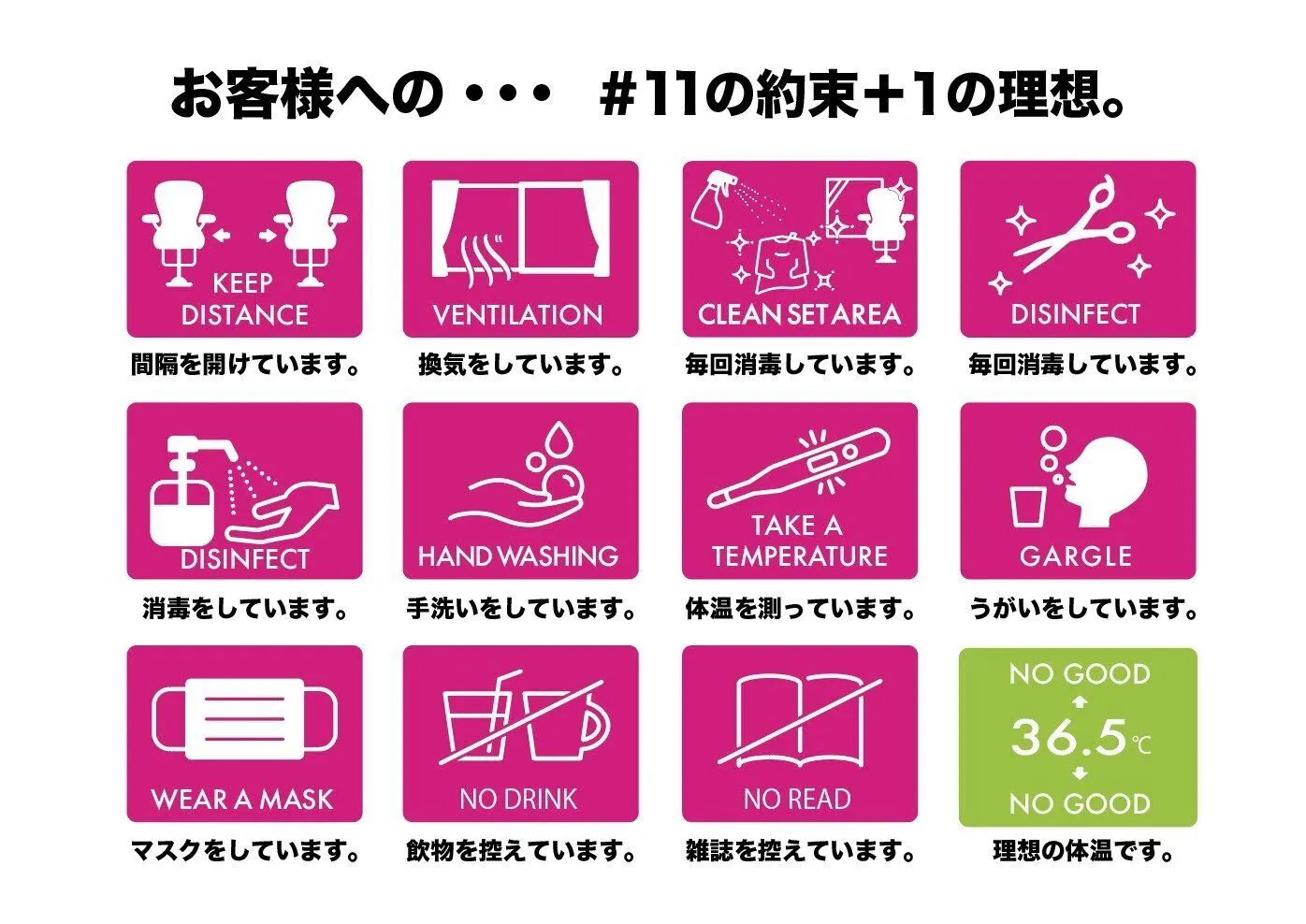 共にクラスターが発生事案を増やさないよう、厚労省、保健所、各自治体が推奨している対策のそれ以上を徹底して美容業界をお互いに守っていきましょう。そして、やっててよかったというお言葉をお客様からたくさんもらいたいですね!