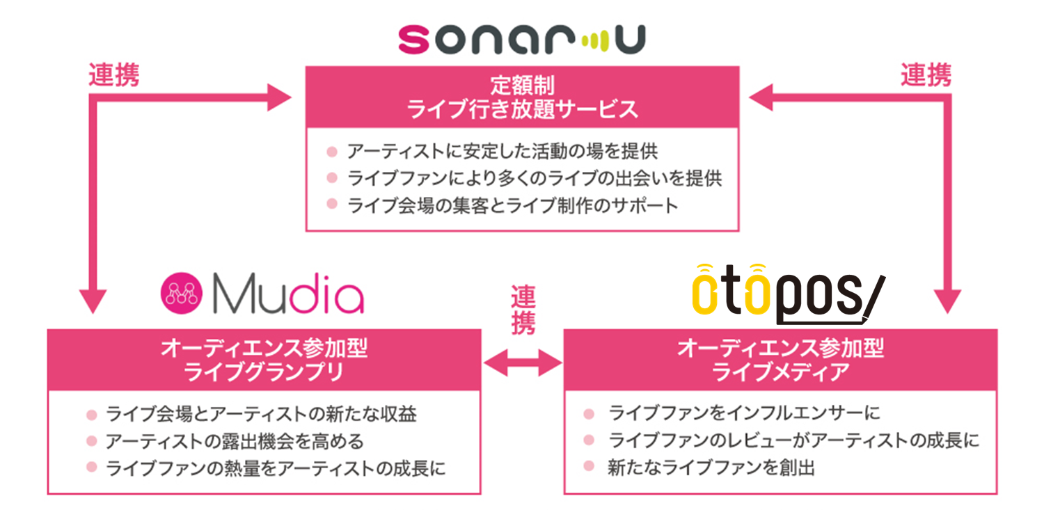 日頃より定額制ライブ行き放題サービス「sonar-u」,オーディエンス参加型ライブグランプリ「Mudia」、オーディエンス参加型ライブメディア「otopos」をご支援頂き誠にありがとうございます。