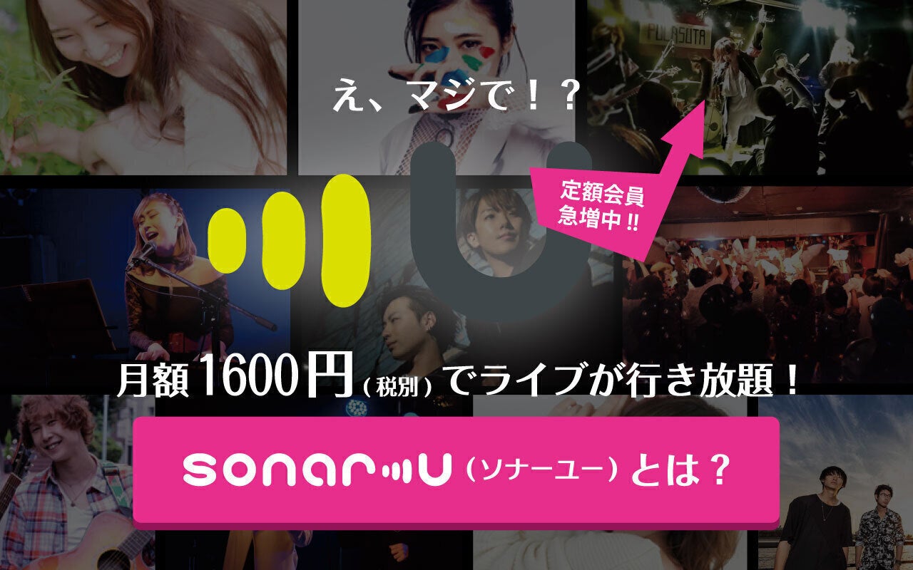 『sonar-u』は、街中で日常的にライブを楽しむ人々のライフスタイルをサポートすると共に、そのライフスタイルをより多くの方に共有する事で、街中エンターテインメントを、より身近な遊びとして広めていこうという思いから立ち上がった会員制サービスです。月額1,600円(税抜)をお支払いいただくとフリーパス会員(以下会員)となり、年間1800イベント以上(※2019年度実績)のライブが行き放題となる他、好きなソナーユーの提携アーティストを支援できるアーティストサポートのサービスがあります。