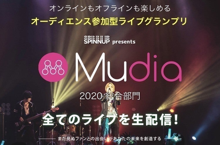 『Mudia』とは、出演アーティストのライブを生配信し、ライブ来場者と視聴者のみの投票でナンバー1パフォーマンスアーティストを決定するライブイベント。アーティストの最高なパフォーマンスをより多くの人に「知ってもらえる」「観てもらえる」「聴いてもらえる」をコンセプトに、2019年1月よりスタートしました。イベント当日にライブハウスに行って応援することはもちろん、遠方からも視聴を通じて好きなアーティストの応援が可能です。