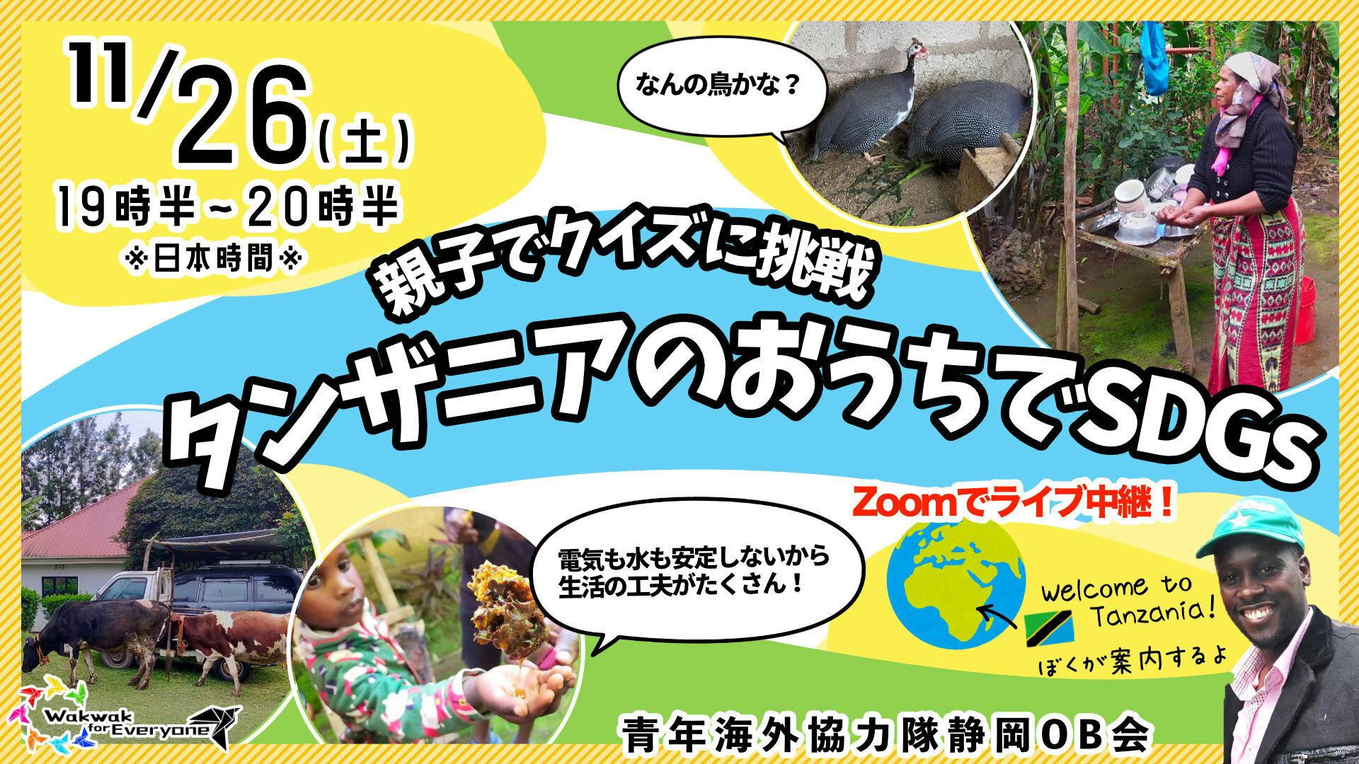 2022/11/21 23:29【お久しぶりです!】カンガdeステイホームで一緒にワクワクしたみなさまへプロジェクトからはや2年半が経ちました。私もあれから色々あり、今は結婚して、夫婦でタンザニアの学校で仕事をさせてもらいつつ、わくわくフォーエブリワンという法人を立ち上げ、オンラインで日本の子どもに世界の様子を届ける活動をしています。(色々やっております!笑)さて、この度、そんなタンザニアと日本をつなぐ親子向けイベントを、特別に参加費無料で実施することになりました。小学生のお子さんのいる方にぜひ参加してほしいな...と思い、久々ですが勇気を出してメッセージを書くことにしました。以下、イベント概要になります。人数制限がありますので、お早めにご応募ください!!!【11/26(土) タンザニアの村とZoomで繋がります!】 青年海外協力隊 静岡OB会と共催で、親子向けオンラインイベントを実施します。 「親子でクイズに挑戦!タンザニアのおうちでSDGs」 タンザニアアルーシャ州の村に住む友人の、工夫いっぱいの家庭とZoomでつなぎ、リアルタイムで現地の生活を見ながらクイズに挑戦してもらいます。 ぜひ、小学生のお子さんと保護者の方で一緒にご参加ください。 以下のイベントの詳細をよく読んでからお申込みをお願いします。https://wakwak4e.jp/event006/親子でクイズに挑戦!タンザニアのおうちでSDGs日時:11月26 日(土)19:30〜20:30場所:オンライン(Zoom)定員:30名費用:無料申込:以下のリンク先から必要事項を記入ください。https://forms.gle/fqayYKneRZaHcmHU6イベント前日までにZoomの参加リンクをお送りします。 締切:11 月24日(木)(※但し、定員に達し次第、申込みを締切らせていただきます。) もっと見る