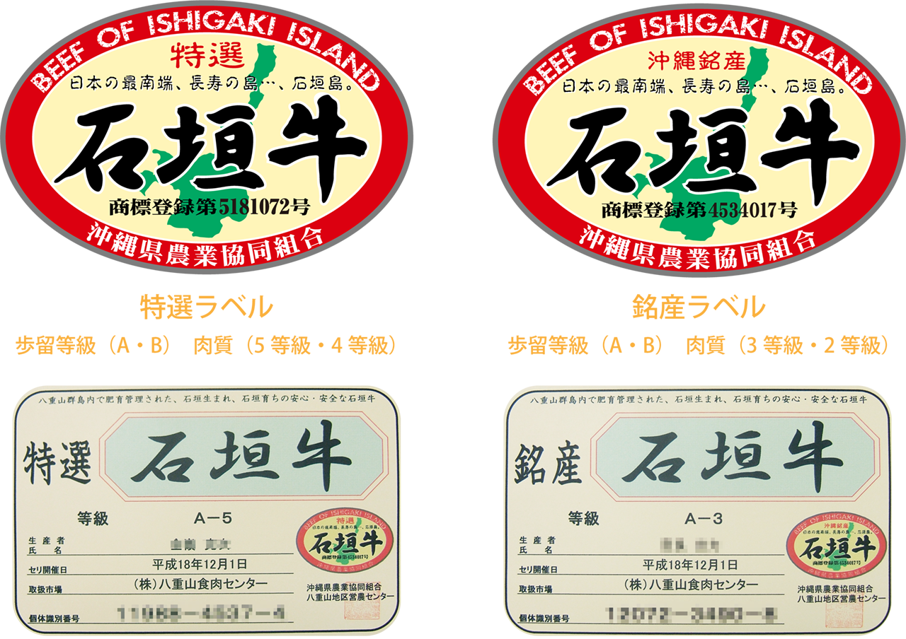 銘産:歩留等級(A・B)肉質等級(3等級・2等級)4、1~3までの条件を満たした枝肉に対し石垣牛ラベルを発行する。5、店舗販売業者においては、JAおきなわの発行する「石垣牛」ラベルで表示致します。