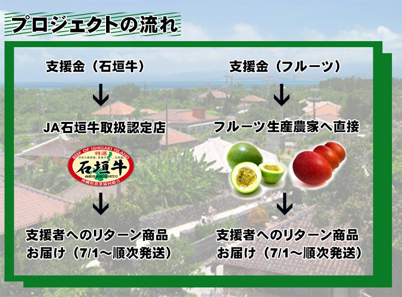 支援してくださった皆様からの石垣島復活支援金は、リターン商品の購入金(農家、畜産農家への支援)とさせていただきます。