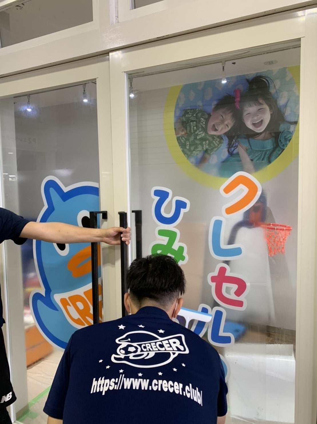 本日は事務所を写真プロジェクトのためにリニューアル。手先の器用な飯塚コーチと黒木コーチが、クレセルのマスコットキャラクター セルカくん(仮名)のポスターをガラス扉に水貼りしてくれました。まるで職人さん!内装はこれからですが、藤木がDIYでフローリングを敷きます。上手に出来るかなースポーツ親子写真の受付や子ども向け商品などの販売もこちらで行います。お楽しみに♪