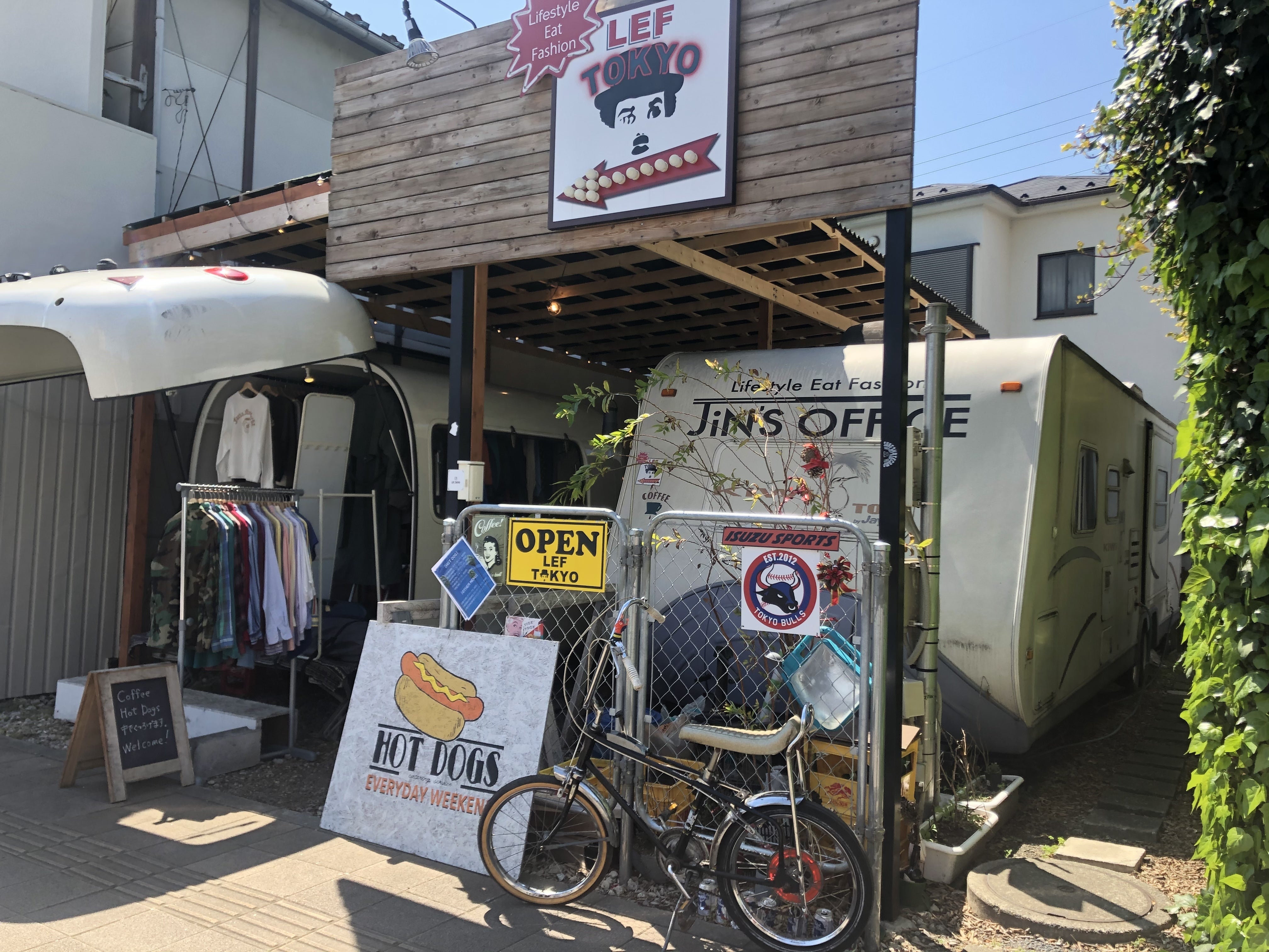 先ず、LEF TOKYOというお店の名前の由来からですがお店をやるにあたって私が軸にしていきたい3つの事の頭文字からきています。L(Life style) E(eat) F(Fashion)の頭文字でざっくり言うなら衣食住です。私自身の好きなモノを中心に暮らしに寄り添い、スタイリッシュに、食事にもこだわり、オシャレな服を着る。そういった日常の充実を大事にしたいという一心でやっています。そんな充実をお客様と共有し日々を彩っていきたいという想いがこもっています。その第一弾として“走る古着屋”をキャンピングトレーラーで厳選した古着やオリジナルアイテム、その他小物も自分自身が大好きなものを前提に提供させて頂いてます。第二弾が福生でトレーラーハウスを活用した飲食店になっています。そこではオリジナルブレンドでこだわったコーヒーや自家製ソーセージを使ったホットドッグ、地域の地ビールやクラフトビール、提案するものがお客様の日常をより充実したものになるようこだわりの商品をどのジャンルでも提供させていただいてます。それら全てが私のこだわりです。
