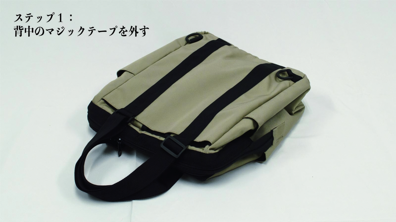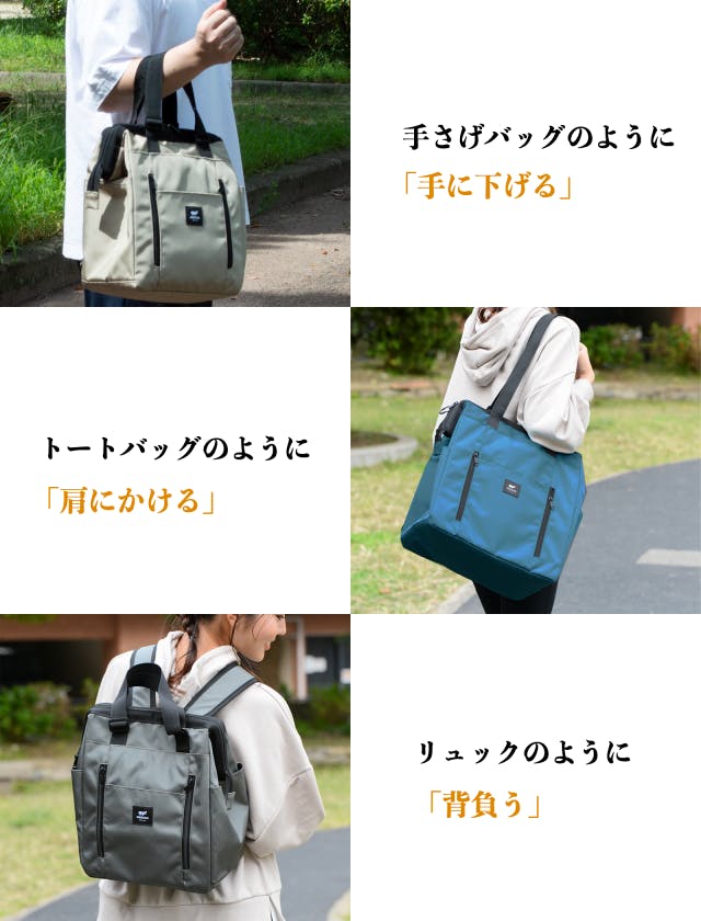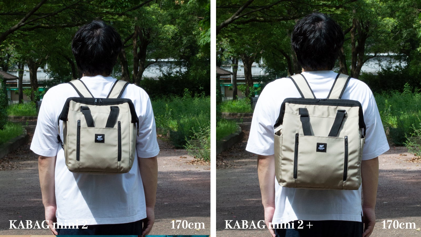 手提げ、トート、リュックとして使える3WAY仕様が、「KABAG mini 」の大きな特長で「KABAG mini 2」にも引き継がれています。トートからリュックにすれば両手が空くので何かと便利。