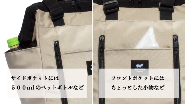 フロントポケットにはちょっとした小物等を、サイドポケットにはペットボトルやタオル等を入れられます。