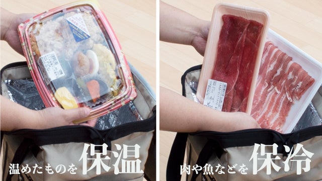 気取らないよそいきバッグにも見える「KABAG mini2」ですが、「保温保冷機能つきのエコバッグ」というかなりの実用派です。保温・保冷の性能はKABAGを継承。温めた食べものを保温、魚や野菜、肉などを保冷することで鮮度をキープ。