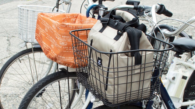 近くのスーパーやショッピングモールに自転車で行くときにも、前かごにおさまるコンパクトサイズの「KABAG mini2」は重宝します。