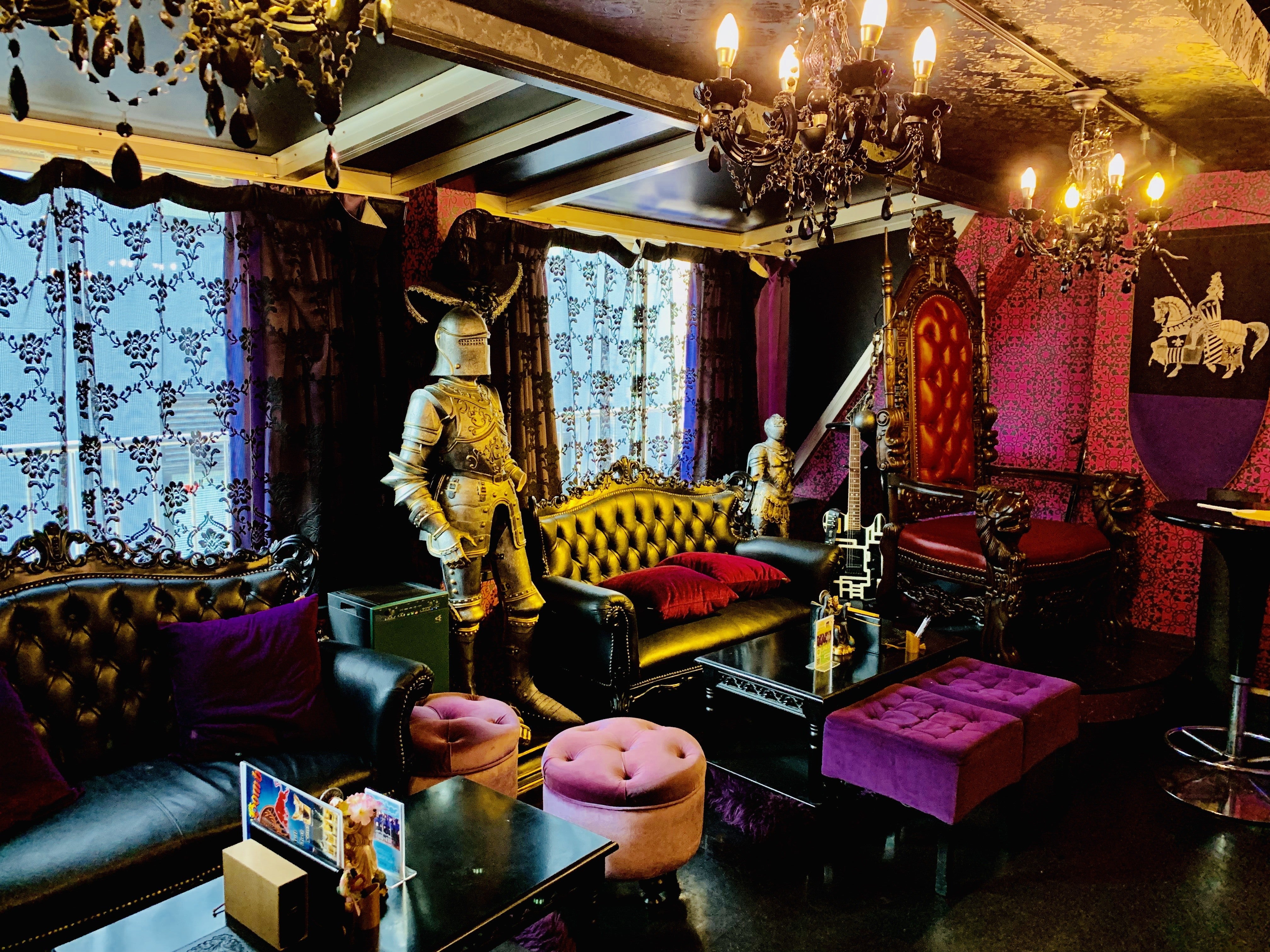 パープル&ブラックをベースカラーとした店内はシャンデリアが吊るされ煌びやかで豪華絢爛な中世ヨーロッパを舞台に、紳士淑女の集うワンランク上の社交場ハイクオリティー且つラグジュアリーなカフェバーとなっております。