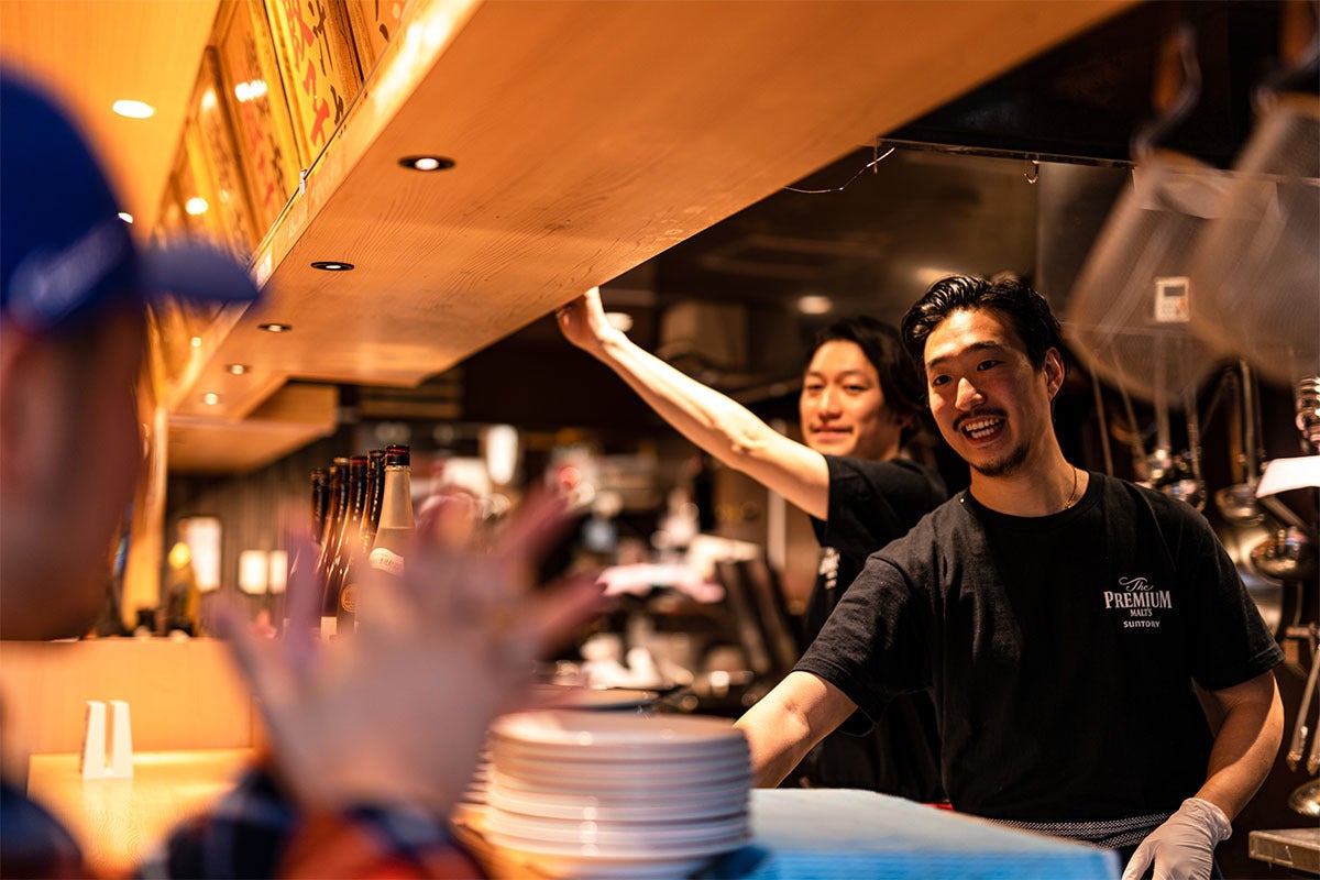 カウンター越しで常連さんとスタッフが談笑する姿。