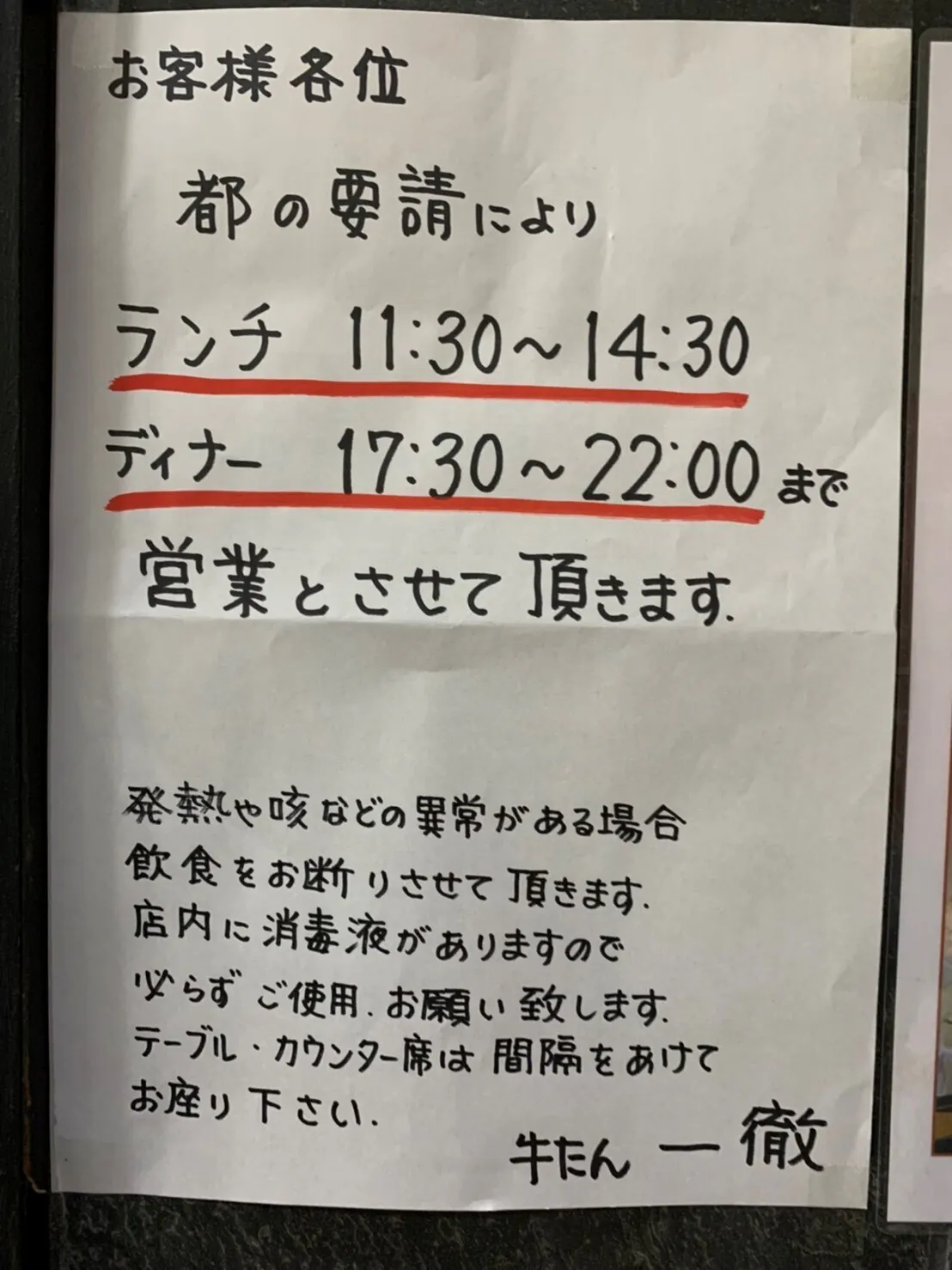 2020/05/26 10:53こんにちは!ようやく緊急事態宣言が解除されました!まだまだ油断はできない状況ですが、医療従事者様の献身的な対応、そして日本全国民が自粛に協力してきた成果ですね。様々なことに感謝しております。少しずつ外出を楽しみ、当店も含めた飲食店も元気になっていくことを願っております。さて、当店は緊急事態宣言解除を受け、営業時間が変更となりました。夜は17:30-22:00となりましたので、どうぞよろしくお願い致します。またコロナ対策として、消毒の徹底、席に間隔をあけるなどの対応をしております。久しぶりの外食を是非楽しんで頂けますと幸いです。ご支援者様におかれましては、この度のプロジェクトへの支援、心よりお礼申し上げます。リターンは7月以降の食券配信を予定しております。そのころにはさらに街に活気が出てくることを願っております!徐々に気温も上がってくる頃ですので、牛タンでパワーをつけてほしいと思っております♪六本木 牛たん 一徹 もっと見る